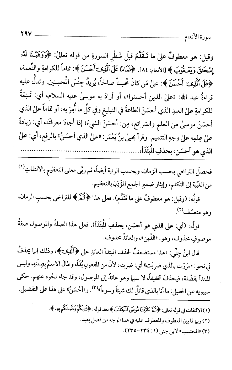 قال ابن جني: "هذا مستضعف لحذف المبتدأ العائد على (الذي)، وذلك إنما يحذف في نحو: "مررت بالذي ضربت" أي: ضربته، لأن من المفعول بداً، وطال الاسم بصلته، وليس المبتدأ بفضلة، فيحذف تخفيفاً، لاسيما وهو عائد إلى الموصول، وقد جاء نحوه عنهم. حكي سيبويه عن الخليل: ما أنا بالذي قائل لك شيئاً وسوءاً". و"أحسن" على هذا على التفضيل.