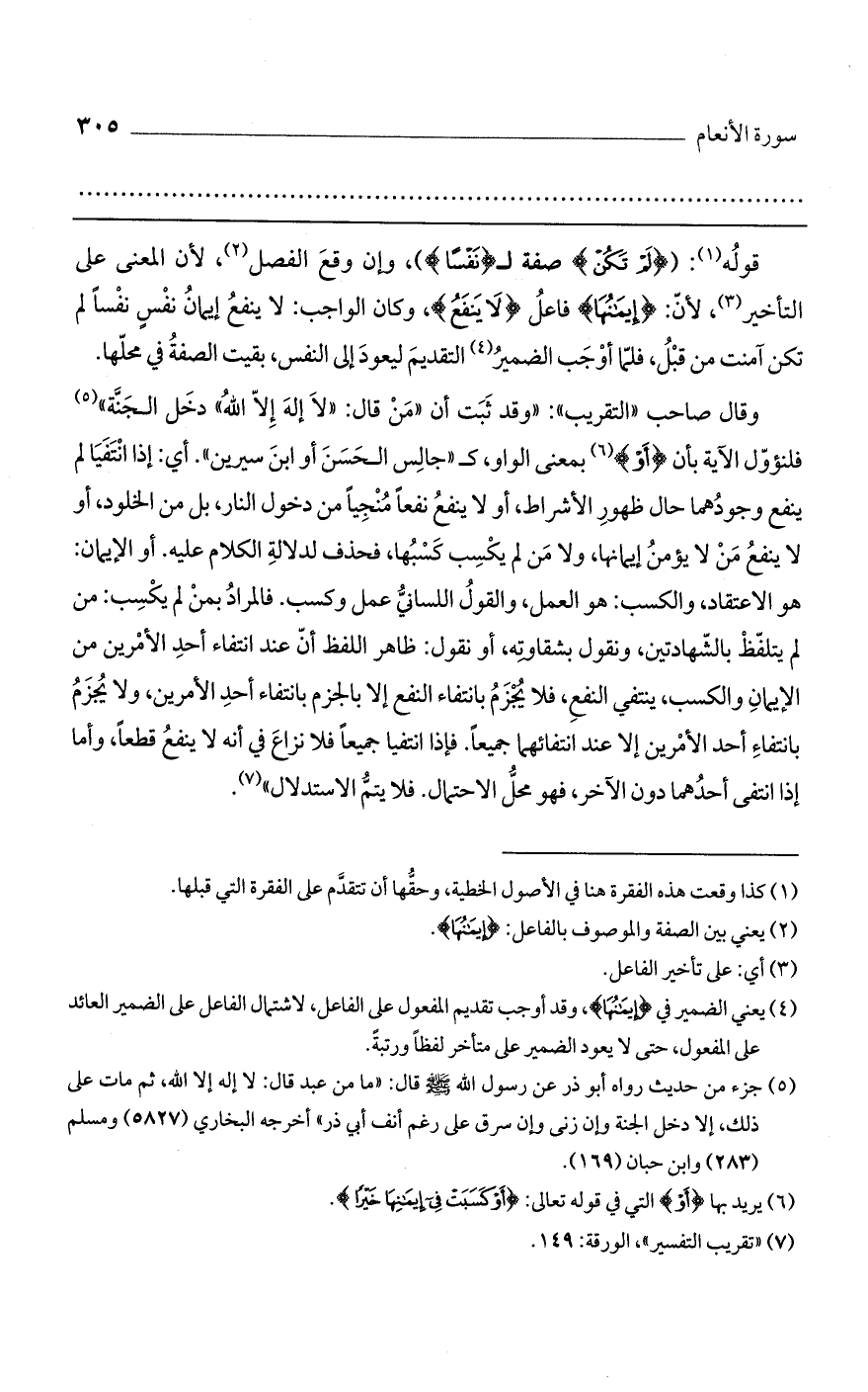 قوله: ((لم تكن) صفة لـ (نفساً)، وإن وقع الفصل، لأن المعنى على التأخير، لأن: (إيمانها) فاعل (لا ينفع)، وكان الواجب: لا ينفع إيمان نفسٍ نفساً لم تكن آمنت من قبل، فلما أوجب الضمير التقديم ليعود إلى النفس، بقيت الصفة في محلها.