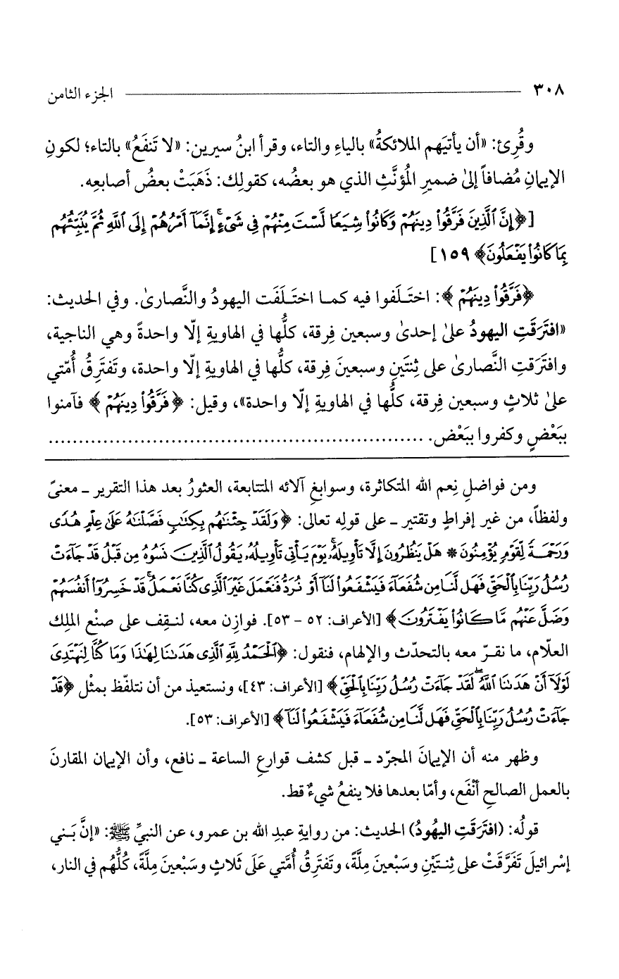 [(إِنَّ الَّذِينَ فَرَّقُوا دِينَهُمْ وَكانُوا شِيَعاً لَسْتَ مِنْهُمْ فِي شَيْءٍ إِنَّما أَمْرُهُمْ إِلَى اللَّهِ ثُمَّ يُنَبِّئُهُمْ بِما كانُوا يَفْعَلُونَ)].
