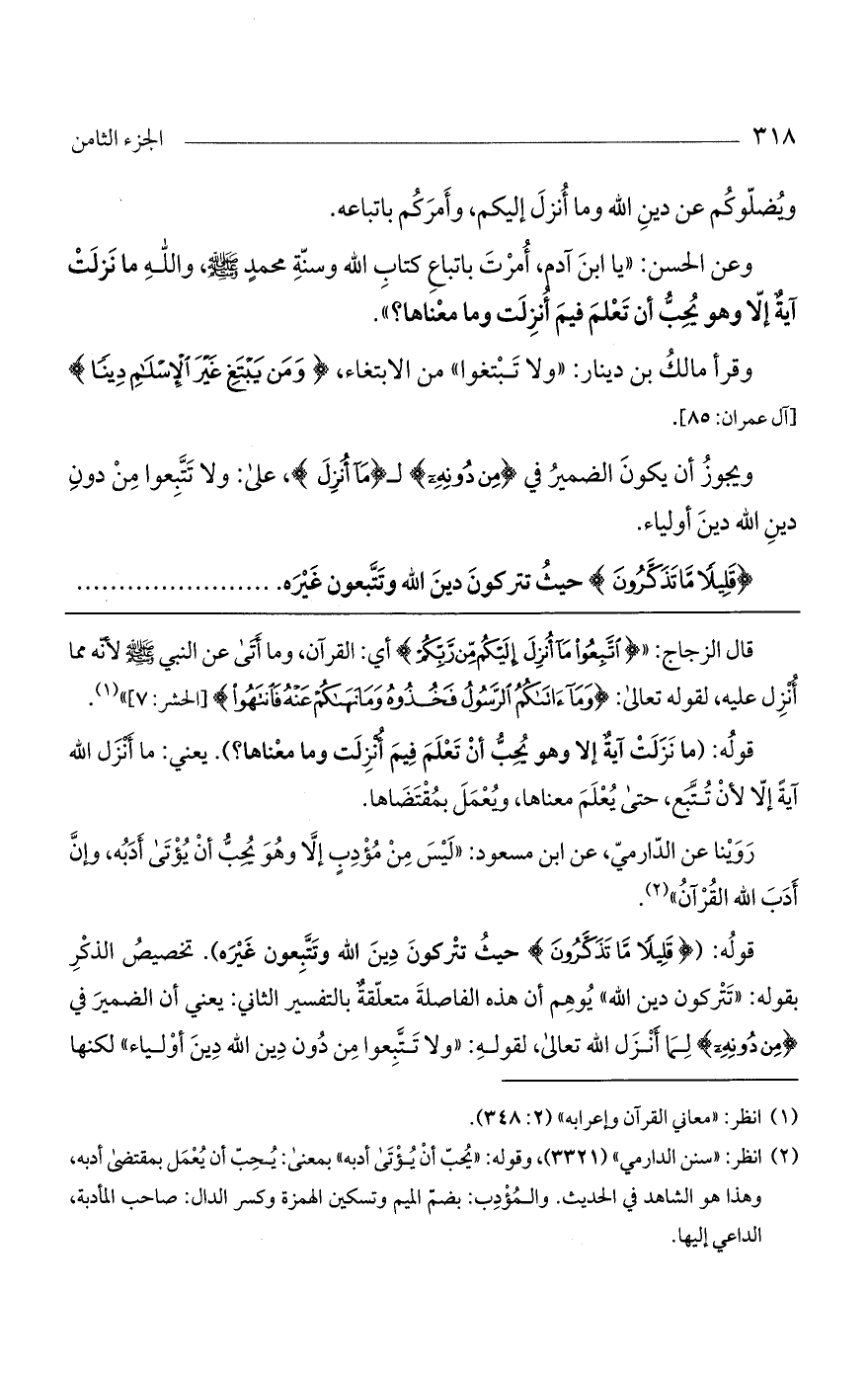 وعن الحسن: "يا ابن آدم، أمرت باتباع كتاب الله وسنة محمدٍ صلى الله عليه وسلم، والله ما نزلت آيةٌ إلا وهو يحب أن تعلم فيم نزلت وما معناها؟ ".
