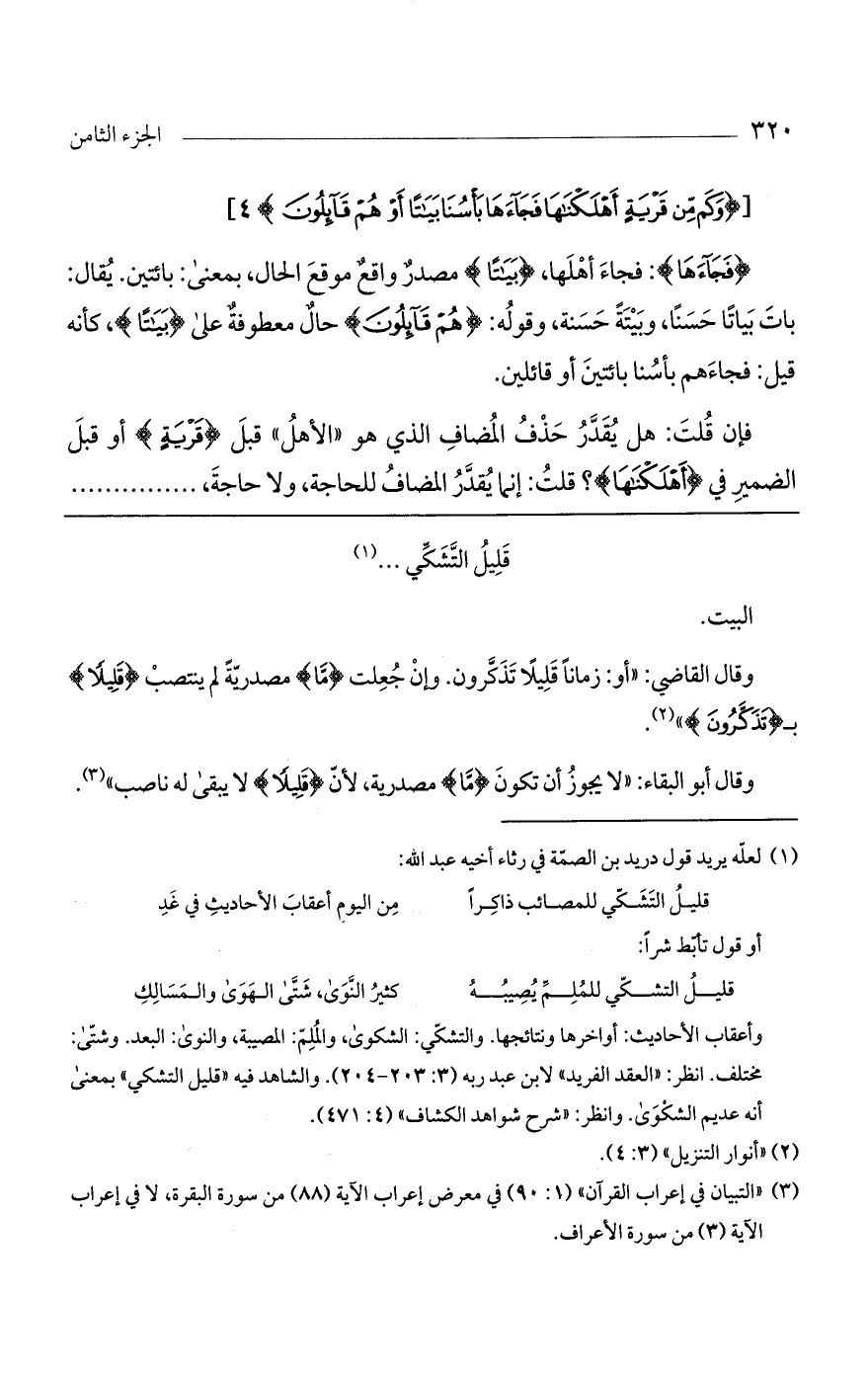 فإن قلت: هل يقدر حذف المضاف الذي هو "الأهل" قبل (قَرْيَةٍ) أو قبل الضمير في (أَهْلَكْناها)؟ قلت: إنما يقدّر المضاف للحاجة ولا حاجة،