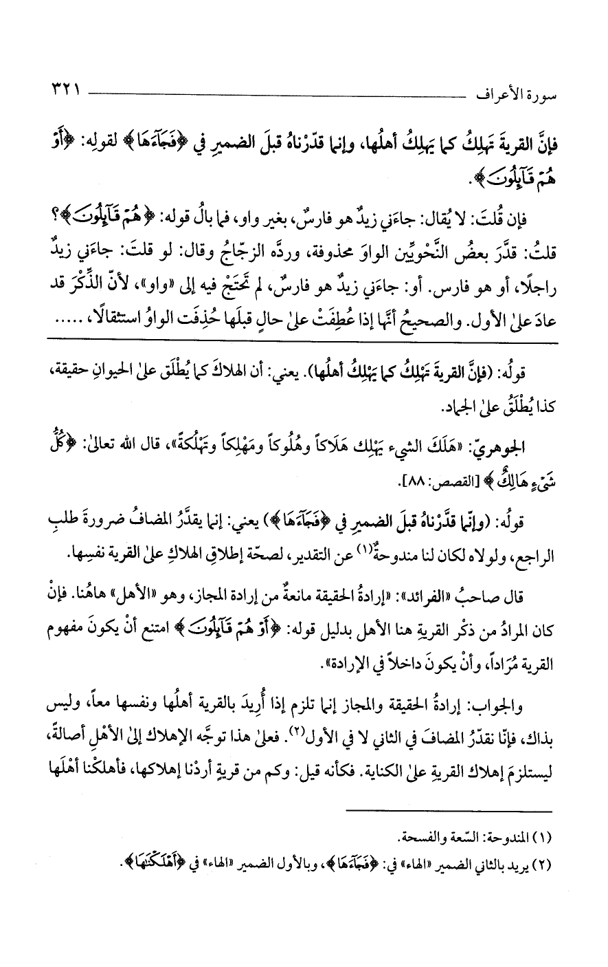 والجواب: إرادة الحقيقة والمجاز إنما تلزم إذا أريد بالقرية أهلها ونفسها معاً، وليس بذاك، فإنا نقدر المضاف في الثاني لا في الأول. فعلى هذا توجه الإهلاك إلى الأهل أصالةً، ليستلزم إهلاك القرية على الكناية. فكأنه قيل: وكم من قريةٍ أردنا إهلاكها، فأهلكنا أهلها