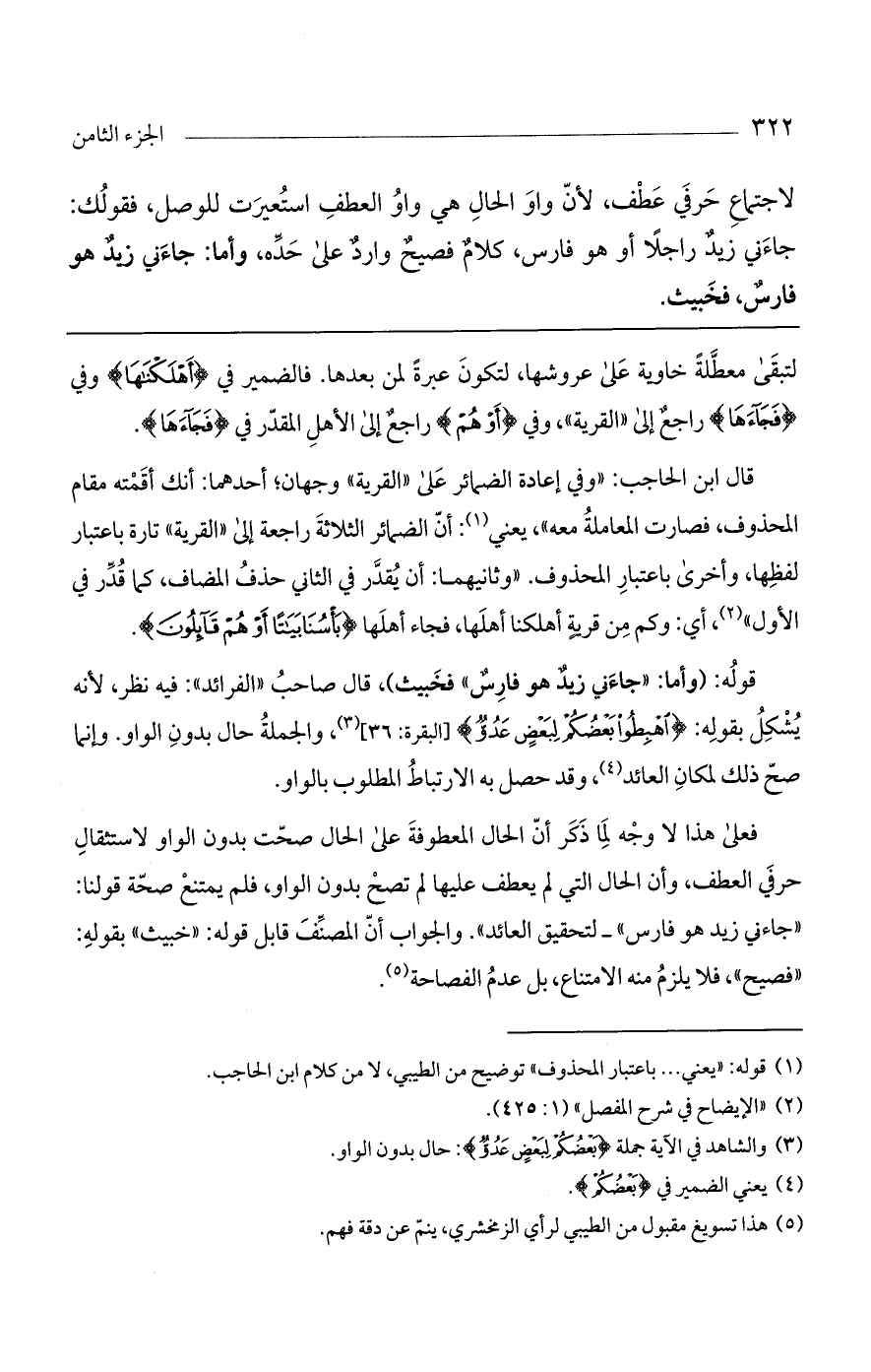 فعلى هذا لا وجه لما ذكر أن الحال المعطوفة على الحال صحت بدون الواو لاستثقال حرفي العطف، وأن الحال التي لم يعطف عليها لم تصح بدون الواو، فلم يمتنع صحة قولنا: "جاءني زيد هو فارس" - لتحقيق العائد". والجواب أن المصنف قابل قوله: "خبيث" بقوله: "فصيح"، فلا يلزم منه الامتناع، بل عدم الفصاحة.