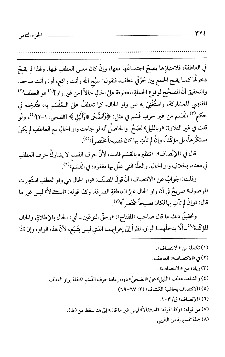 في العاطفة، فلامتيازها يصح اجتماعها معها، وإن كان معنى العطف فيها. ولهذا لم يقبح دخولها كما يقبح الجمع بين حرفي عطف، فنقول: سبح الله وأنت راكع، أو: وأنت ساجد. والتحقيق أن المصحح لوقوع الجملة المعطوفة على الحال حالاً [من غير واو] هو العطف المقتضي للمشاركة، واستغني به عن واو الحال، كما تعطف على المقسم به، فتدخله في حكم القسم من غير حرف قسم في مثل: (وَالضُّحَى * واللَّيْلِ) [الضحى: 1 - 2]، ولو قلت في غير التلاوة: "وبالليل" لصح. والحاصل أنه لو جاءت واو الحال مع العاطف لم يكن مستكرهاً، بل مؤكداً، وإن لم تأت بها كان فصيحاً مختصراً".
