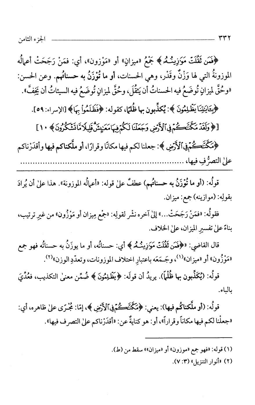 قال القاضي: " (فمن ثقلت موازينه) أي: حسناته، أو ما يوزن به حسناته فهو جمع "موزون" أو "ميزان"، وجمعه باعتبار اختلاف الموزونات، وتعدد الوزن".