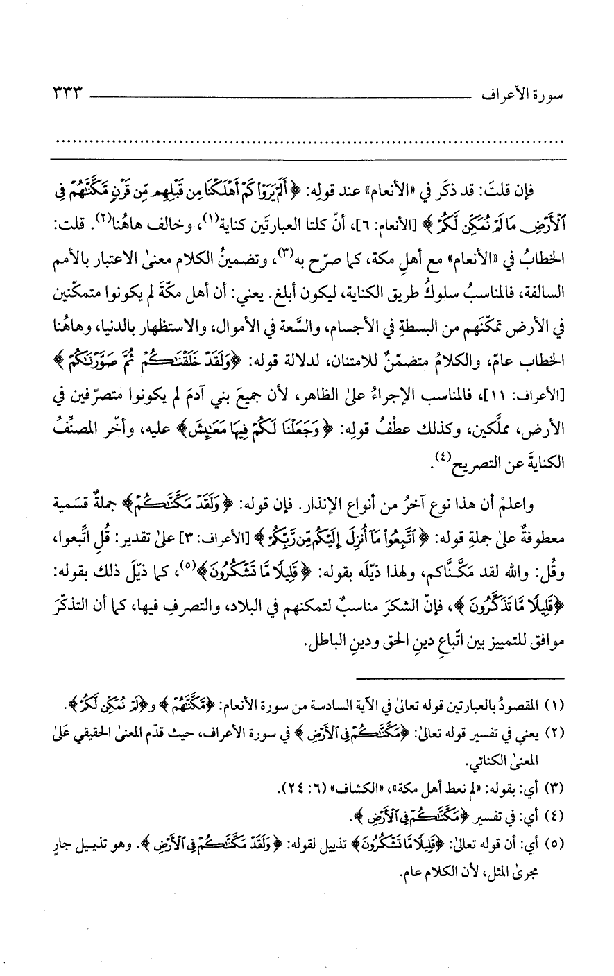 فإن قلت: قد ذكر في "الأنعام" عند قوله: (أَلَمْ يَرَوْا كَمْ أَهْلَكْنَا مِن قَبْلِهِم مِّن قَرْنٍ مَّكَّنَّاهُمْ فِي الأَرْضِ مَا لَمْ نُمَكِّن لَّكُمْ) [الأنعام: 6]، أن كلتا العبارتين كناية، وخالف هاهنا. قلت: الخطاب في "الأنعام" مع أهل مكة، كما صرح به، وتضمين الكلام معنى الاعتبار بالأمم السالفة، فالمناسب سلوك طريق الكناية، ليكون أبلغ. يعني: أن أهل مكة لم يكونوا متمكنين في الأرض تمكنهم من البسطة في الأجسام، والسعة في الأموال، والاستظهار بالدنيا، وهاهنا الخطاب عام، والكلام متضمن للامتنان، لدلالة قوله: (ولَقَدْ خَلَقْنَاكُمْ ثُمَّ صَوَّرْنَاكُمْ) [الأعراف: 11]، فالمناسب الإجراء على الظاهر، لأن جميع بني آدم لم يكونوا متصرفين في الأرض، مملكين، وكذلك عطف قوله: (وجَعَلْنَا لَكُمْ فِيهَا مَعَايِشَ) عليه، وأخر المصنف الكناية عن التصريح.