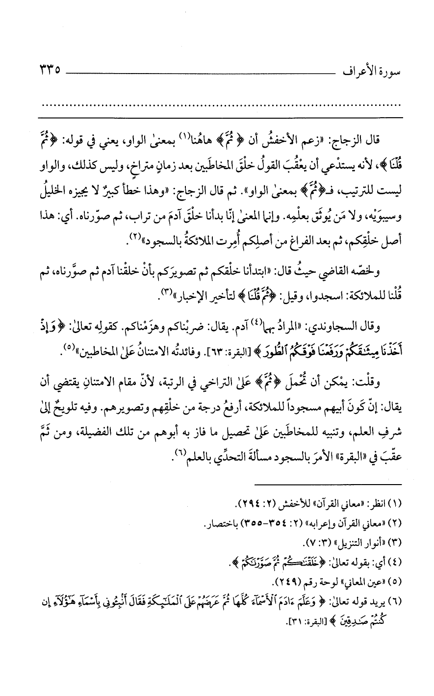 قال الزجاج: "زعم الأخفش أن (ثم) هاهنا بمعنى الواو، يعني في قوله: (ثم قلنا)، لأنه يستدعي أن يعقب القول خلق المخاطبين بعد زمانٍ متراخٍ، وليس كذلك، والواو ليست للترتيب، فـ (ثم) بمعنى الواو". ثم قال الزجاج: "وهذا خطأ كبير لا يجيزه الخليل وسيبويه، ولا من يوثق بعلمه. وإنما المعنى إنا بدأنا خلق آدم من تراب، ثم صورناه. أي: هذا أصل خلقكم، ثم بعد الفراغ من أصلكم أمرت الملائكة بالسجود".