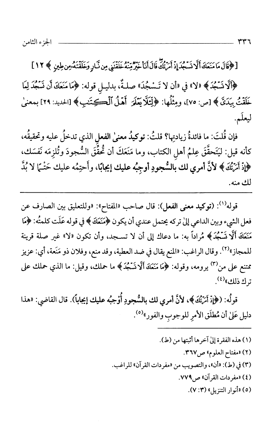 قوله: (توكيد معنى الفعل): قال صاحب "المفتاح": "وللتعليق بين الصارف عن فعل الشيء وبين الداعي إلى تركه يحتمل عندي أن يكون (منعك) في قوله علت كلمته: (ما منعك ألا تسجد) مراداً به: ما دعاك إلى أن لا تسجد، وأن تكون "لا" غير صلة قرينة للمجاز". وقال الراغب: "المنع يقال في ضد العطية، وقد منع، وفلان ذو منعة، أي: عزيز ممتنع على من يرومه، وقوله: (مَا مَنَعَكَ أَلاَّ تَسْجُدَ) ما حملك، وقيل: ما الذي حملك على ترك ذلك".