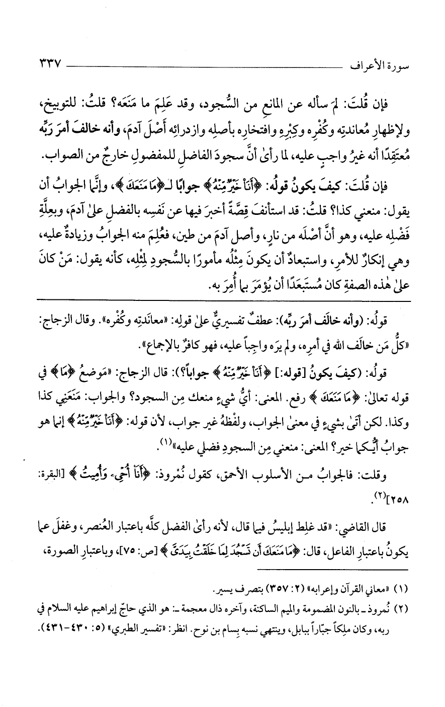 قوله: (كيف يكون [قوله: ] (أنا خير منه) جواباً؟ ): قال الزجاج: "موضع (ما) في قوله تعالى: (ما منعك) رفع. المعنى: أي شيءٍ منعك من السجود؟ والجواب: منعني كذا وكذا. لكن أتى بشيءٍ في معنى الجواب، ولفظه غير جواب، لأن قوله: (أنا خير منه) إنما هو جواب أيكما خير؟ المعنى: منعني من السجود فضلي عليه".