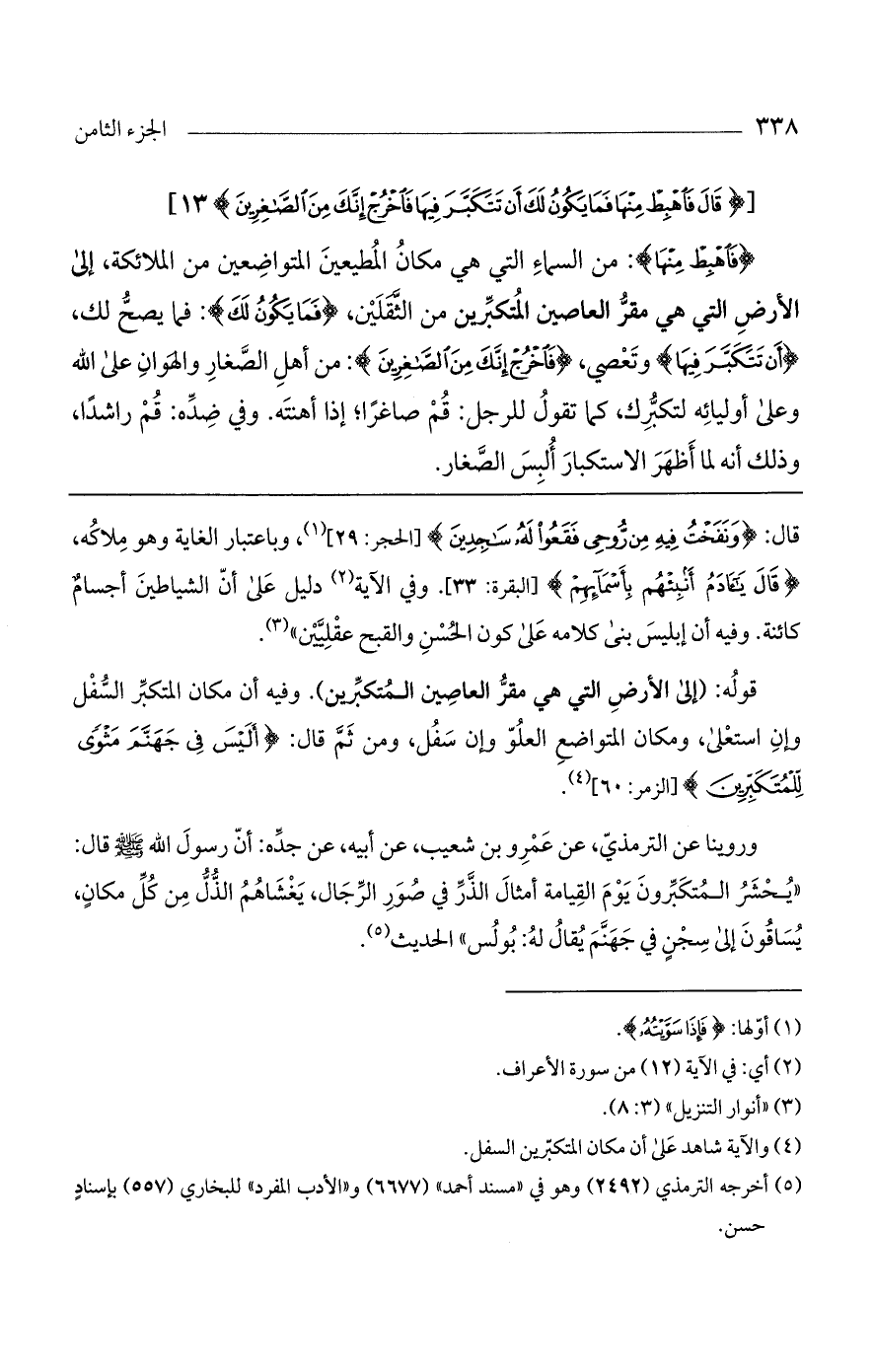 قوله: (إلى الأرض التي هي مقر العاصين المتكبرين). وفيه أن مكان المتكبر السفل وإن استعلى، ومكان المتواضع العلو وإن سفل، ومن ثم قال: (أَلَيْسَ فِي جَهَنَّمَ مَثْوًى لِّلْمُتَكَبِّرِينَ) [الزمر: 60].