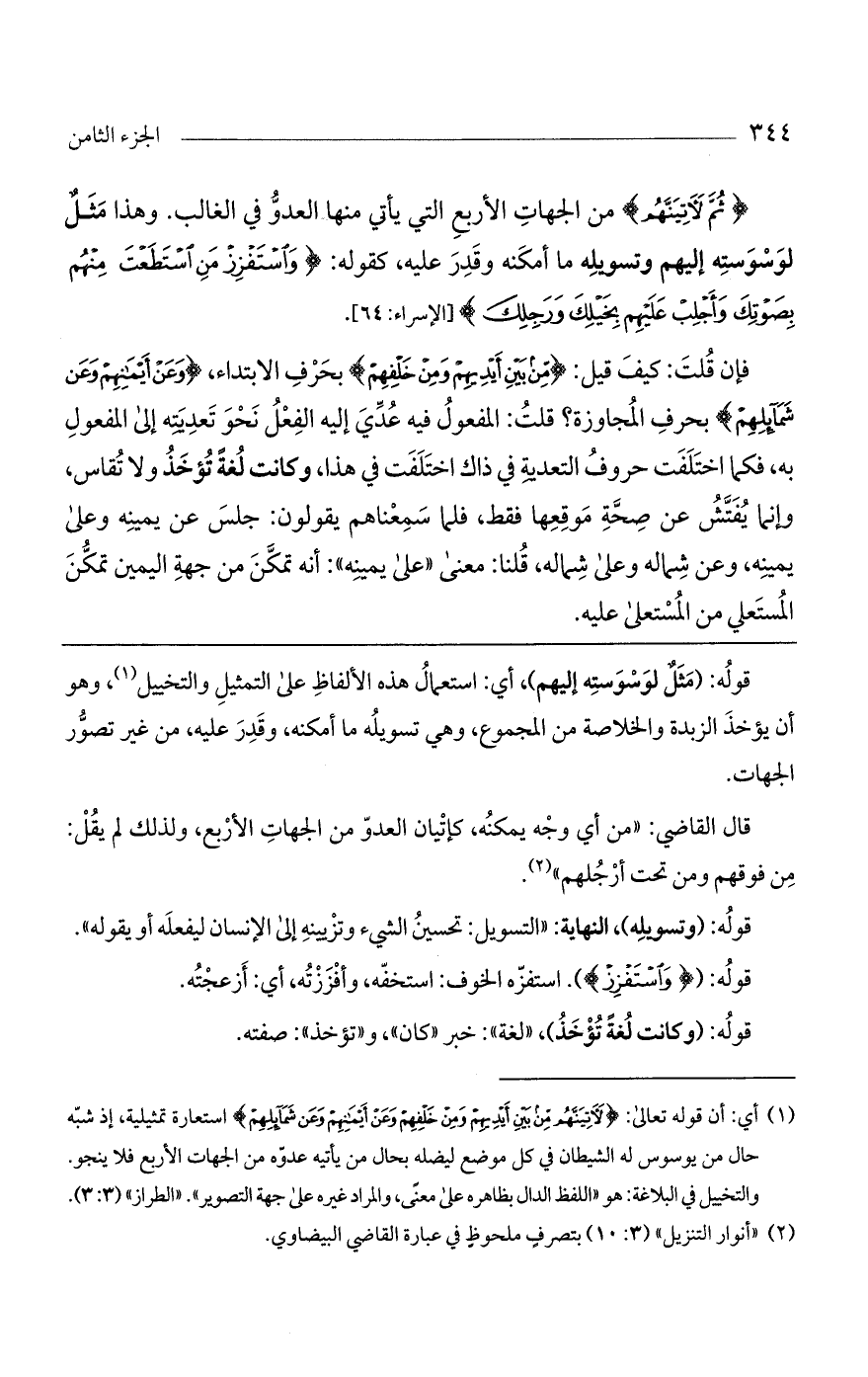 فإن قلت: كيف قيل: (مِنْ بَيْنِ أَيْدِيهِمْ وَمِنْ خَلْفِهِمْ) بحرف الابتداء، (وَعَنْ أَيْمانِهِمْ وَعَنْ شَمائِلِهِمْ) بحرف المجاوزة؟ قلت: المفعول فيه عدّي إليه الفعل نحو تعديته إلى المفعول به، فكما اختلفت حروف التعدية في ذاك اختلفت في هذا، وكانت لغة تؤخذ ولا تقاس، وإنما يفتش عن صحة موقعها فقط، فلما سمعناهم يقولون: جلس عن يمينه وعلى يمينه، وعن شماله وعلى شماله، قلنا: معنى «على يمينه» أنه تمكن من جهة اليمين تمكن المستعلي من المستعلى عليه.