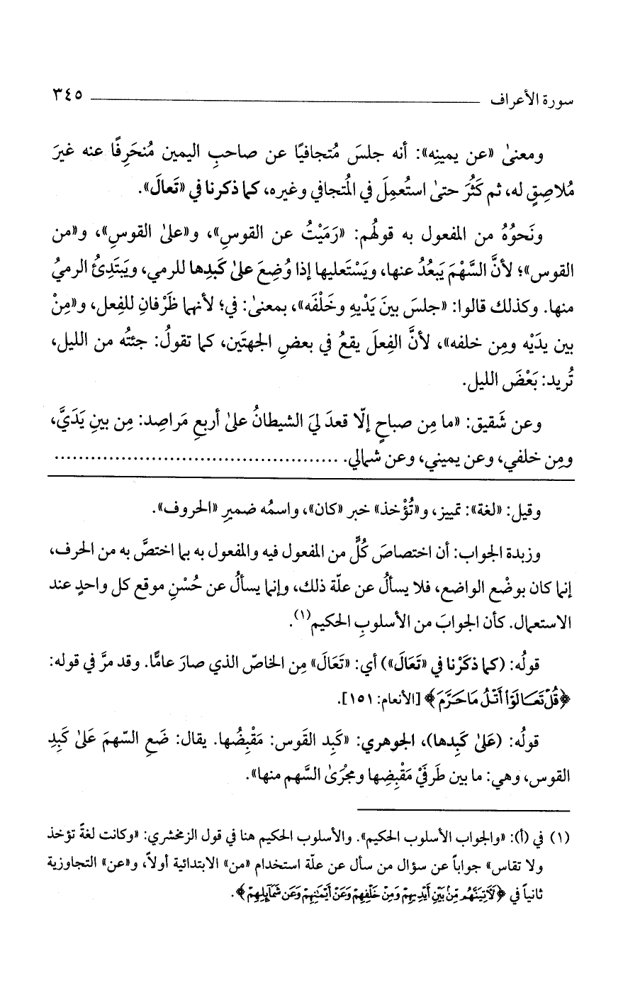 ومعنى «عن يمينه»: أنه جلس متجافياً عن صاحب اليمين منحرفاً عنه غير ملاصقٍ له، ثم كثر حتى استعمل في المتجافي وغيره، كما ذكرنا في «تعال».