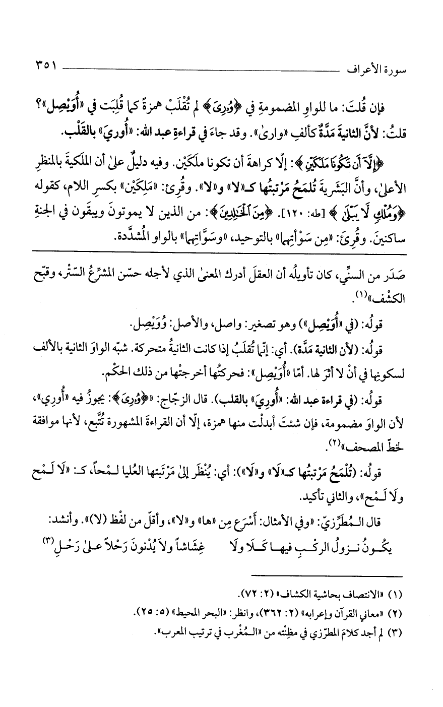 فإن قلت: ما للواو المضمومة في (وورى) لم تقلب همزةً كما قلت في "أويصل"؟ قلت: لأن الثانية مدّة كألف "وارى". وقد جاء في قراءة عبد الله "أوري"، بالقلب.