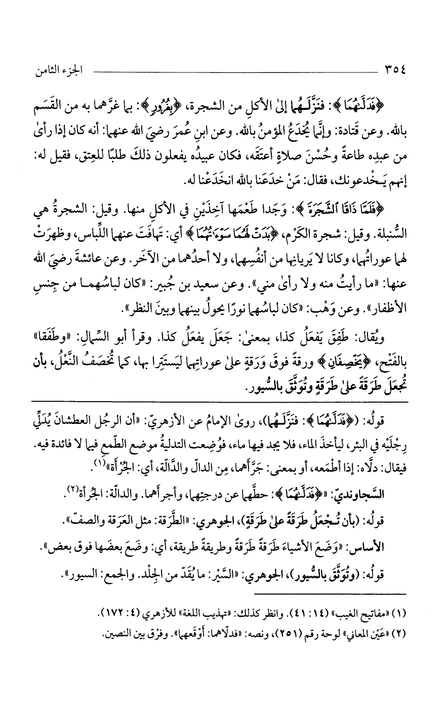(فَلَمَّا ذاقَا الشَّجَرَةَ): وجدا طعمها آخذين في الأكل منها. وقيل: الشجرة هي السنبلة. وقيل: شجرة الكرم، (بَدَتْ لَهُما سَوْآتُهُما) أي: تهافت عنهما اللباس، فظهرت لهما عوراتهما، وكانا لا يريانها من أنفسهما، ولا أحدهما من الآخر. وعن عائشة رضي الله عنها: "ما رأيت منه ولا رأى مني". وعن سعيد بن جبير: "كان لباسهما من جنس الأظفار". وعن وهب: "كان لباسهما نوراً يحول بينهما وبين النظر".