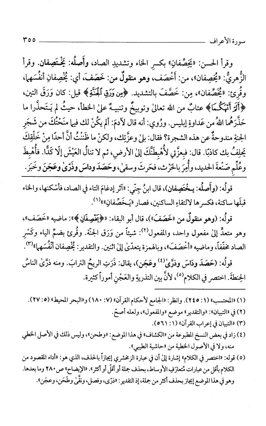 قوله: (وأصله: يختصفان)، قال ابن جني: "آثر إدغام التاء في الصاد، فأسكنها، والخاء قبلها ساكنة، فكسرها لالتقاء الساكنين، فصار "يخصفان"".