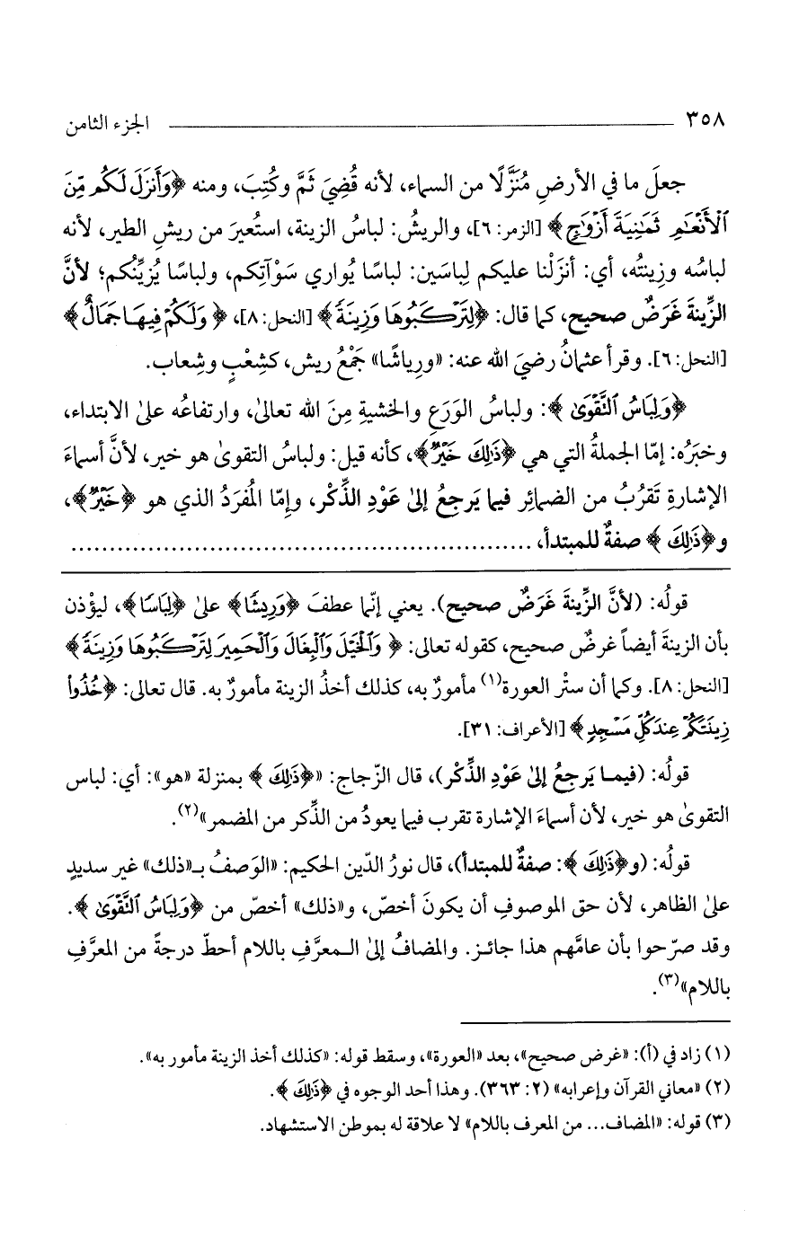 قوله: (و (ذلك): صفة للمبتدأ)، قال نور الدين الحكيم: "الوصف بـ"ذلك" غير سديد على الظاهر، لأن حق الموصوف أن يكون أخص، و"ذلك" أخص من (ولباس التقوى) وقد صرحوا بأن عامهم هذا جائز. والمضاف إلى المعرف باللام أحط درجةً من المعرف باللام".