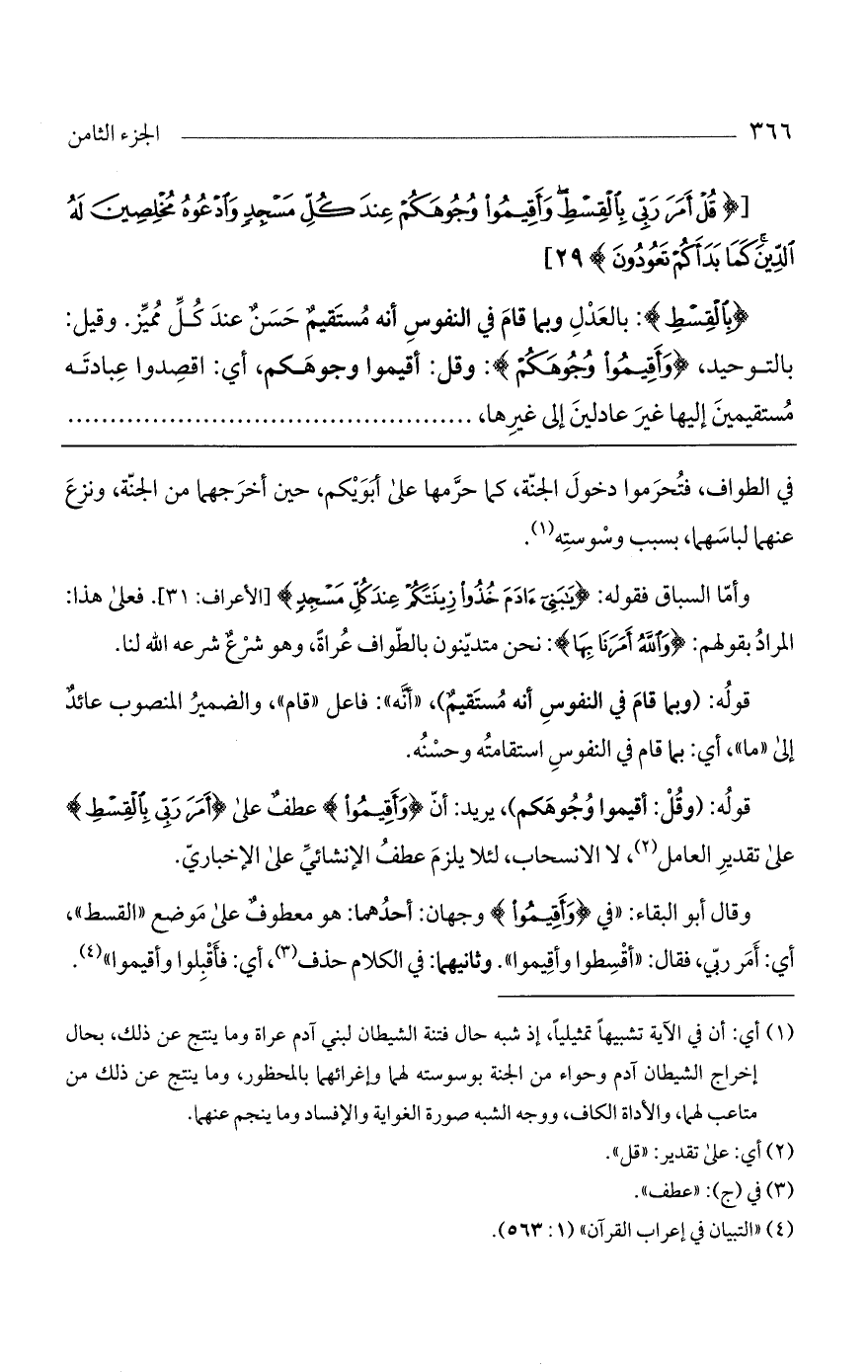 (بِالْقِسْطِ): بالعدل وبما قام في النفوس أنه مستقيم حسن عند كل مميز. وقيل: بالتوحيد، (وَأَقِيمُوا وُجُوهَكُمْ): وقل: أقيموا وجوهكم، أي: اقصدوا عبادته مستقيمين إليها غير عادلين إلى غيرها،