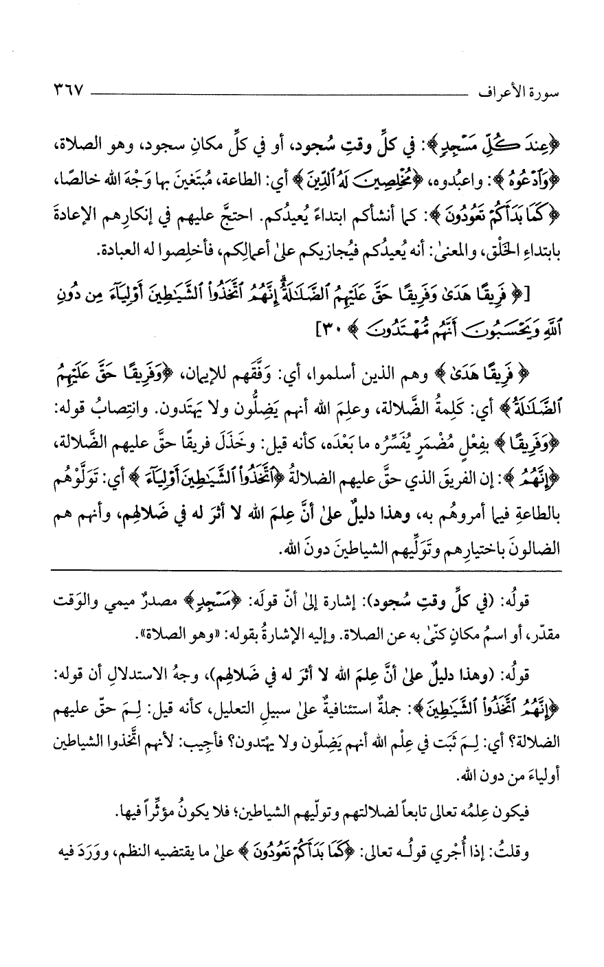(عِنْدَ كُلِّ مَسْجِدٍ): في كل وقت سجود، أو في كل مكان سجود وهو الصلاة (وَادْعُوهُ): واعبدوه (مُخْلِصِينَ لَهُ الدِّينَ) أي: الطاعة، مبتغين بها وجه الله خالصاً، (كَما بَدَأَكُمْ تَعُودُونَ): كما أنشأكم ابتداءً يعيدكم، احتجّ عليهم في إنكارهم الإعادة بابتداء الخلق، والمعنى: أنه يعيدكم فيجازيكم على أعمالكم، فأخلصوا له العبادة.