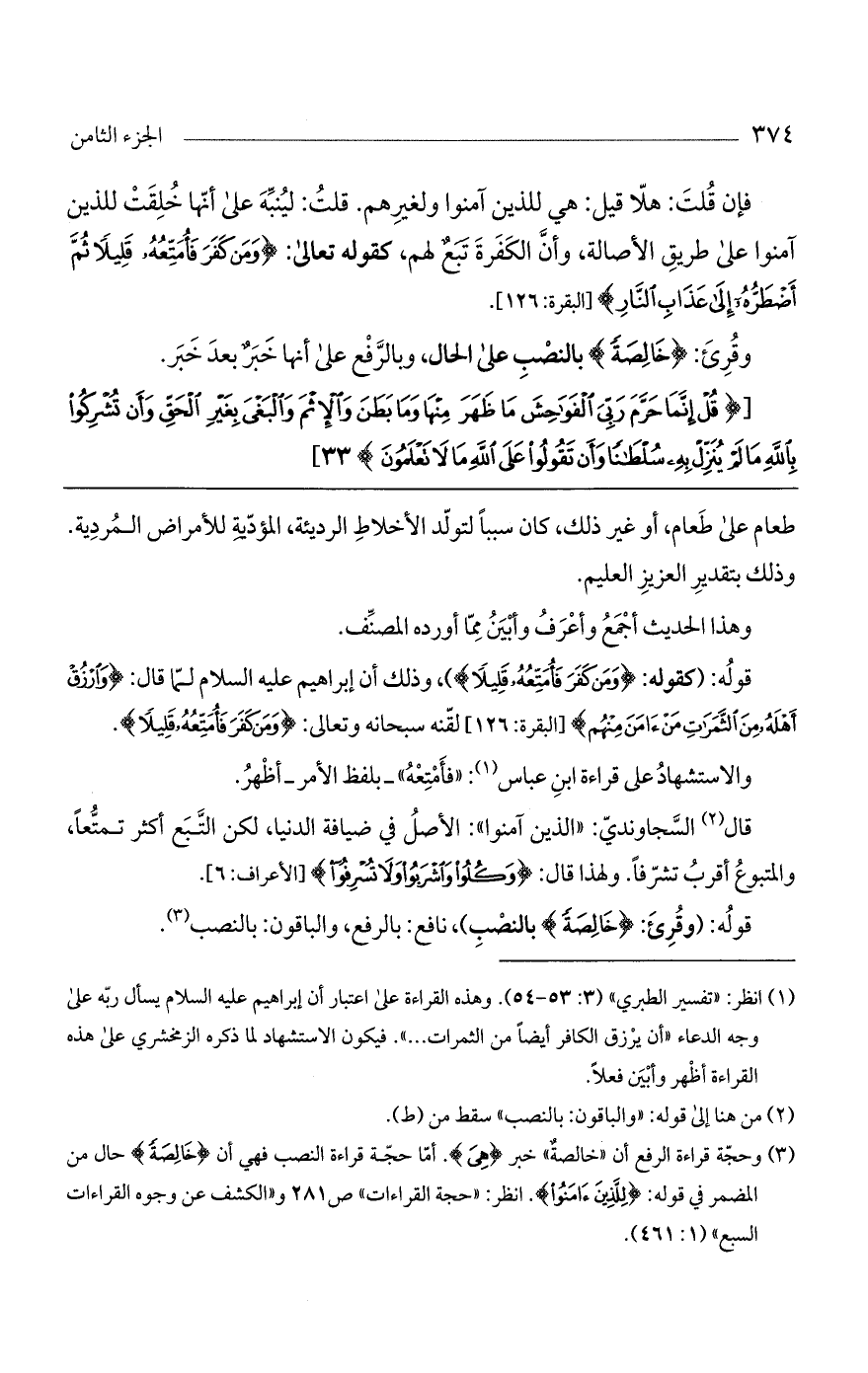 قوله: (وقرئ: (خالصةً) بالنصب)، نافع: بالرفع، والباقون: بالنصب.