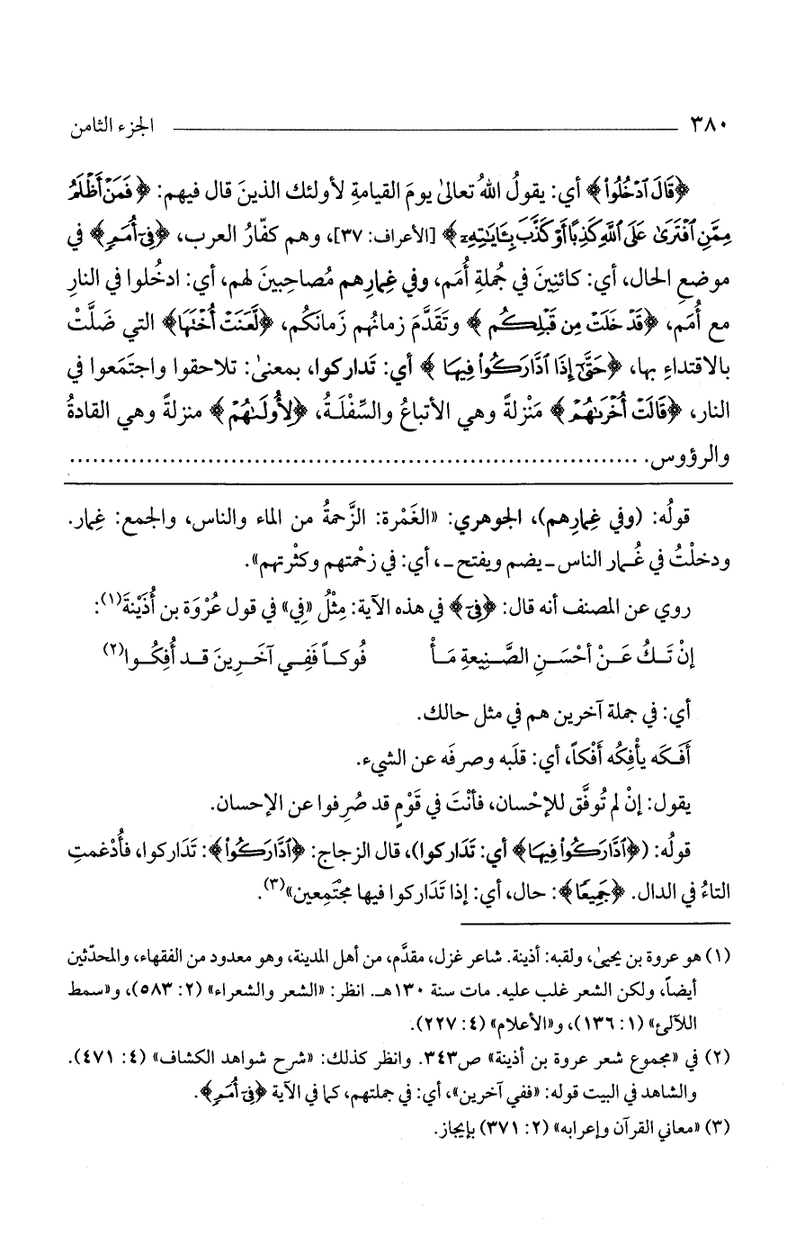 (قالَ ادْخُلُوا) أي: يقول الله تعالى يوم القيامة لأولئك الذين قال فيهم: (فَمَنْ أَظْلَمُ مِمَّنِ افْتَرى عَلَى اللَّهِ كَذِباً أَوْ كَذَّبَ بِآياتِهِ) [الأعراف: 37]، وهم كفار العرب، (فِي أُمَمٍ) في موضع الحال، أي: كائنين في جملة أمم، وفي غمارهم مصاحبين لهم، أي: ادخلوا في النار مع أمم، (قَدْ خَلَتْ مِنْ قَبْلِكُمْ) وتقدّم زمانهم زمانكم (لَعَنَتْ أُخْتَها) التي ضلت بالاقتداء بها، (حَتَّى إِذَا ادَّارَكُوا فِيها) أي: تداركوا، بمعنى: تلاحقوا واجتمعوا في النار، (قالَتْ أُخْراهُمْ) منزلةً وهي الأتباع والسفلة، (لِأُولاهُمْ) منزلةً وهي القادة والرؤوس