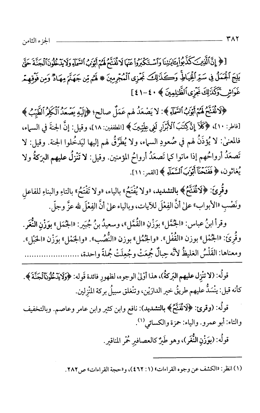 وقرأ ابن عباس: "الجُمَّل" بوزن "القُمَّل"، وسعيد بن جبير: "الجُمل" بوزن النغر. وقرئ: "الجمل" بوزن "القفل". "والجمل" بوزن "النصب". "والجمل" بوزن "الحبل". ومعناها: القلس الغليظ «لأنه حبال جمعت وجعلت جملة واحدة،