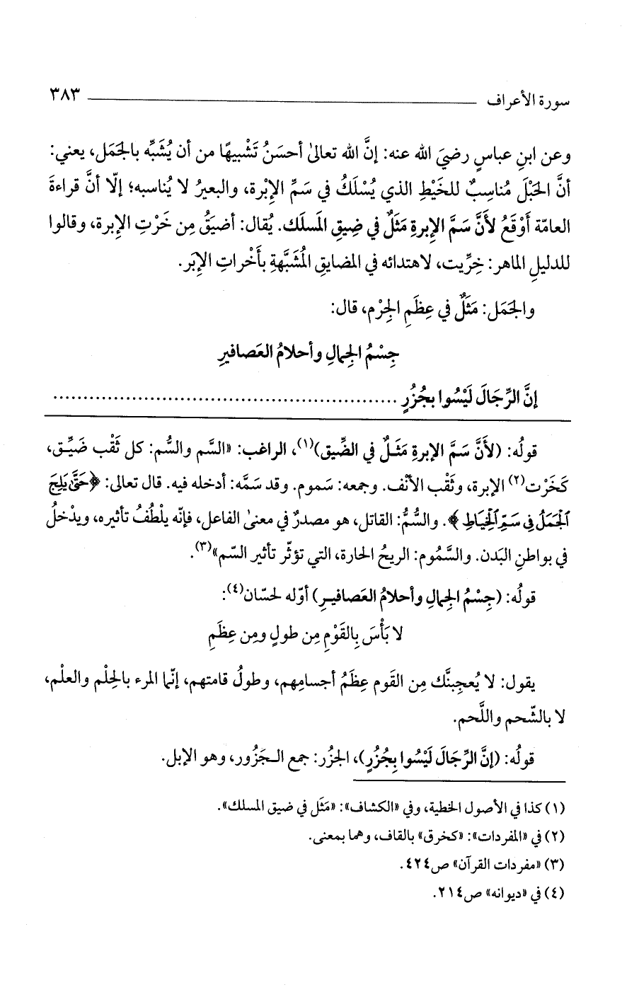 قوله: (لأن سم الإبرة مثل في الضيق)، الراغب: "السم والسم: كل ثقب ضيق، كخرت الإبرة، وثقب الأنف. وجمعه: سموم. وقد سمه: أدخله فيه. قال تعالى: (حَتَّى يَلِجَ الجَمَلُ فِي سَمِّ الخِيَاطِ). والسم: القاتل، هو مصدر في معنى الفاعل، فإنه يلطف تأثيره، ويدخل في بواطن البدن. والسموم: الريح الحارة، التي تؤثر تأثير السم".