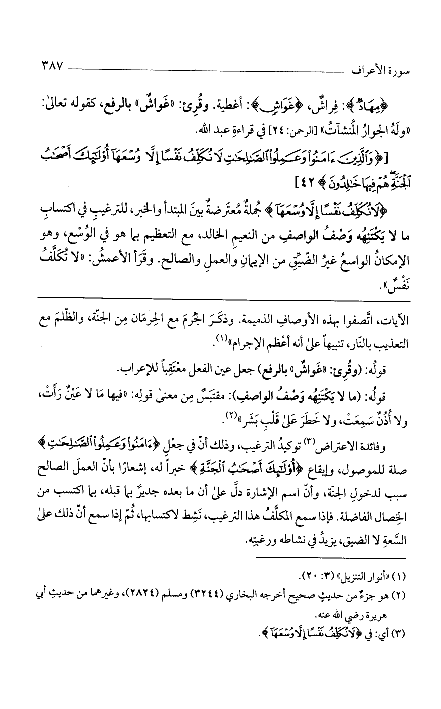 (لا نُكَلِّفُ نَفْساً إِلَّا وُسْعَها) جملة معترضة بين المبتدأ والخبر، للترغيب في اكتساب ما لا يكتنهه وصف الواصف من النعيم الخالد، مع التعظيم بما هو في الوسع، وهو الإمكان الواسع غير الضيق من الإيمان والعمل الصالح. وقرأ الأعمش: "لا تكلف نفسٌ".