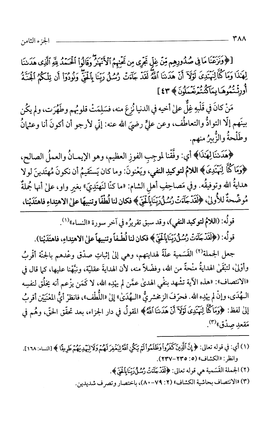 جعل الجملة القسمية علةً لهدايتهم، وهي إلى إثبات صدق وعدهم بالجنة أقرب وأولى، لتبقي الهداية منحةً من الله، وفضلاً منه، لأن الهداية عقلية، ونبهنا عليها، كما قال في "الانتصاف": "هذه الآية تشهد بنفي الهدى عمن لم يهده الله، لا كمن يزعم أنه يخلق لنفسه الهدى، وإن لم يهده الله. فحرف الزمخشري "الهدى" إلى "اللطف"، فانظر أي المعنيين أقرب إلى لفظ: (ومَا كُنَّا لِنَهْتَدِيَ لَوْلا أَنْ هَدَانَا اللَّهُ) المقول في دار الجزاء، بعد تحقق الحق، وهم في مقعد صدق".