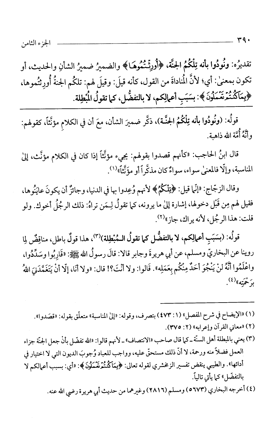قوله: (بسبب أعمالكم، لا بالتفضل كما تقول المبطلة)، هذا قول باطل، مناقض لما روينا عن البخاري ومسلم، عن أبي هريرة وجابر قالا: قال رسول الله صلي الله عليه وسلم: "قاربوا وسددوا، واعلموا أنه لن ينجو أحد منكم بعلمه". قالوا: ولا أنت؟ ! قال: "ولا أنا، إلا أن يتغمدني الله برحمته".