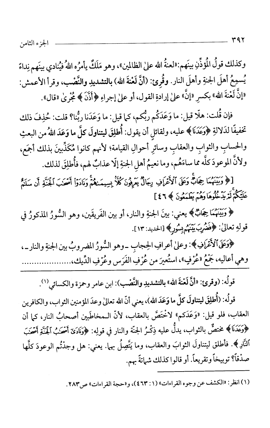 وكذلك قول المؤذن بينهم: "لعنة الله على الظالمين"، وهو ملك يأمره الله فينادي بينهم نداءً يُسمِعُ أهل الجنة وأهل النار. وقرئ: (أنّ لعنة الله) بالتشديد والنصب، وقرأ الأعمش: "إن لعنة الله" بكسر "إن" على إرادة القول، أو على إجراء (أَذَّنَ) مُجرى "قال".