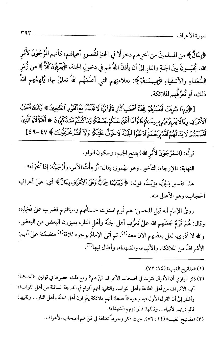 روى الإمام أنه قيل للحسن: هم قوم استوت حسناتهم وسيئاتهم فضرب على فخذه، وقال: هم قوم جعلهم الله على تعرف أهل الجنة وأهل النار، يميزون البعض من البعض. والله لا أدري، لعل بعضهم الآن معنا. ثم آتى الإمام بوجوه ثلاثة متضمنة على أنهم: الأشراف من الملائكة، والأنبياء، والشهداء، وأطال فيها.