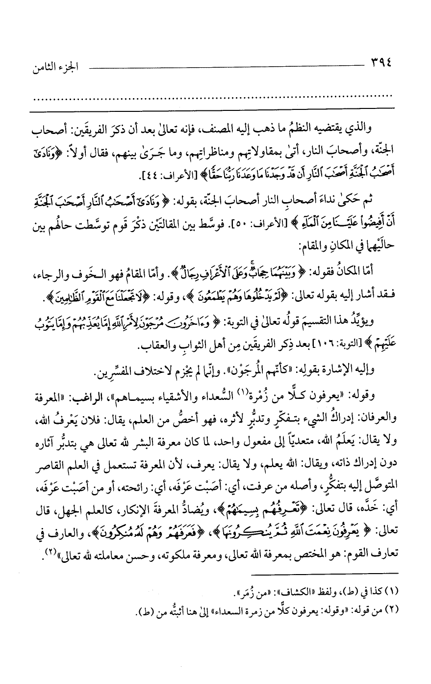 وقوله: "يعرفون كلا من زمرة السعداء والأشقياء بسيماهم"، الراغب: "المعرفة والعرفان: إدراك الشيء بتفكر وتدبر لأثره، فهو أخص من العلم، يقال: فلان يعرف الله، ولا يقال: يعلم الله، متعدياً إلى مفعول واحد، لما كان معرفة البشر لله تعالى هي بتدبر آثاره دون إدراك ذاته، ويقال: الله يعلم، ولا يقال: يعرف، لأن المعرفة تستعمل في العلم القاصر المتوصل إليه بتفكر، وأصله من عرفت، أي: أصبت عرفه، أي: رائحته، أو من أصبت عرفه، أي: خده، قال تعالى: (تعرفهم بسيماهم)، ويضاد المعرفة الإنكار، كالعلم الجهل، قال تعالى: (يَعْرِفُونَ نِعْمَتَ اللَّهِ ثُمَّ يُنكِرُونَهَا)، (فَعَرَفَهُمْ وهُمْ لَهُ مُنكِرُونَ)، والعارف في تعارف القوم: هو المختص بمعرفة الله تعالى، ومعرفة ملكوته، وحسن معاملته لله تعالى".