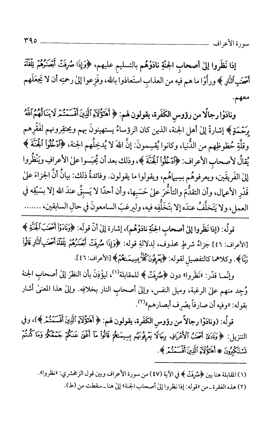 قوله: (ونادوا رجالاً من رؤوس الكفرة، يقولون لهم: (أَهَؤُلاءِ الَّذِينَ أَقْسَمْتُمْ))، وفي التنزيل: (ونَادَى أَصْحَابُ الأَعْرَافِ رِجَالاً يَعْرِفُونَهُمْ بِسِيمَاهُم قَالُوا مَا أَغْنَى عَنكُمْ جَمْعُكُمْ ومَا كُنتُمْ تَسْتَكْبِرُونَ (48) أَهَؤُلاءِ الَّذِينَ أَقْسَمْتُمْ).