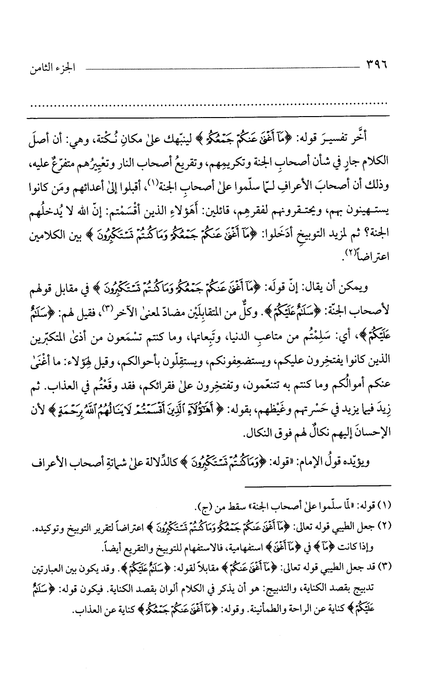 أخر تفسير قوله: (ما أغنى عنكم جمعكم) لينبهك على مكان نكتة، وهي: أن أصل الكلام جار في شأن أصحاب الجنة وتكريمهم، وتقريع أصحاب النار وتعييرهم متفرع عليه، وذلك أن أصحاب الأعراف لما سلموا على أصحاب الجنة، أقبلوا إلى أعدائهم ومن كانوا يستهينون بهم، ويحتقرونهم لفقرهم، قائلين: أهؤلاء الذين أقسمتم: إن الله لا يدخلهم الجنة؟ ثم لمزيد التوبيخ ادخلوا: (مَا أَغْنَى عَنكُمْ جَمْعُكُمْ ومَا كُنتُمْ تَسْتَكْبِرُونَ) بين الكلامين اعتراضًا.
