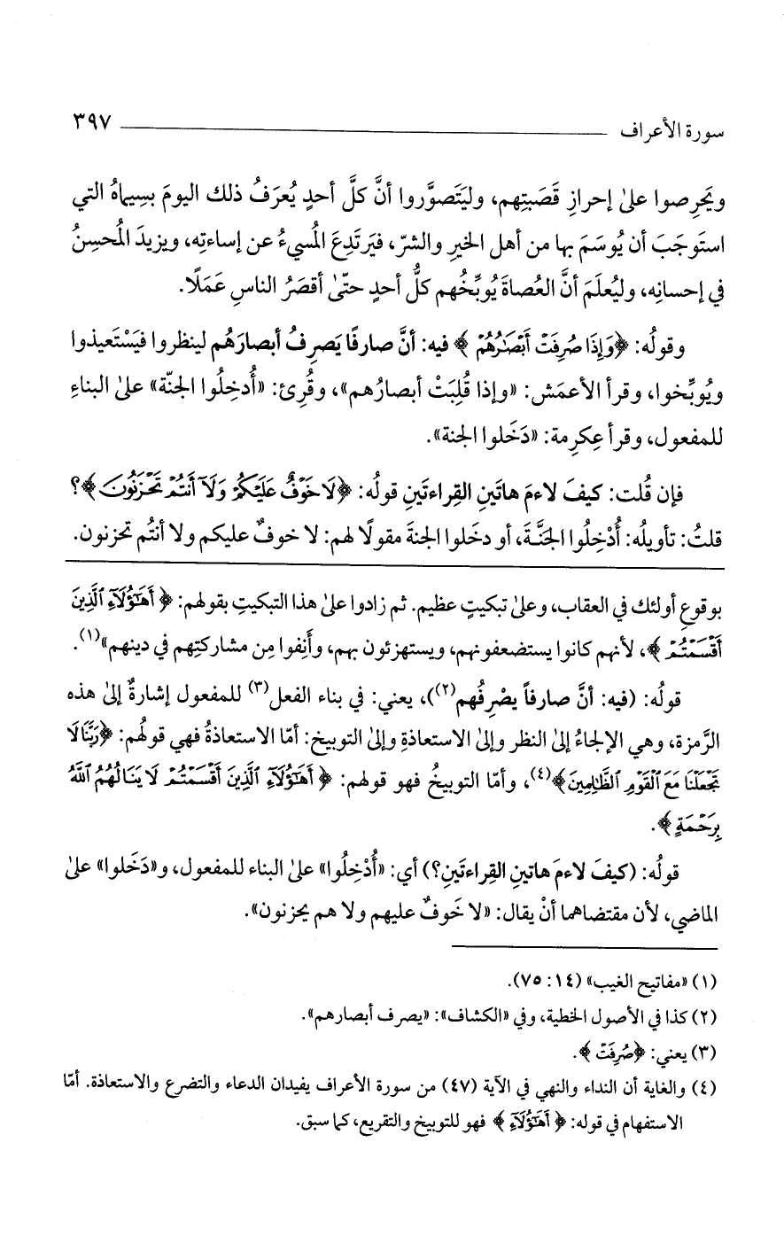 وقوله: (وَإِذا صُرِفَتْ أَبْصارُهُمْ) فيه: أن صارفاً يصرف أبصارهم لينظروا فيستعيذوا ويوبخوا وقرأ الأعمش: "وإذا قلبت أبصارهم"، وقرئ: "أدخلوا الجنة" على البناء للمفعول، وقرأ عكرمة: "دخلوا الجنة".