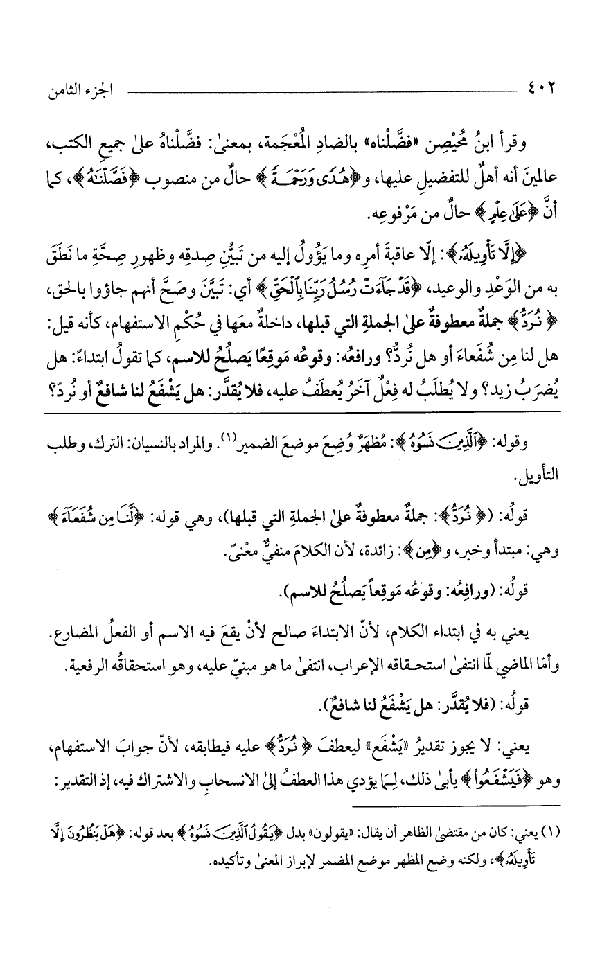 (إِلَّا تَاوِيلَهُ): إلا عاقبة أمره وما يؤول إليه من تبين صدقه وظهور صحة ما نطق به من الوعد والوعيد، (قَدْ جاءَتْ رُسُلُ رَبِّنا بِالْحَقِّ) أي: تبين وصحّ أنهم جاءوا بالحق، (نُرَدُّ) جملة معطوفةٌ على الجملة التي قبلها، داخلة معها في حكم الاستفهام، كأنه قيل: هل لنا من شفعاء، أو هل نُردّ؟ ورافعه: وقوعه موقعاً يصلح للاسم، كما تقول ابتداءً: هل يضرب زيد؟ ولا يطلب له فعلٌ آخر يعطف عليه، فلا يقدّر: هل يشفع لنا شافعٌ أو نردّ؟