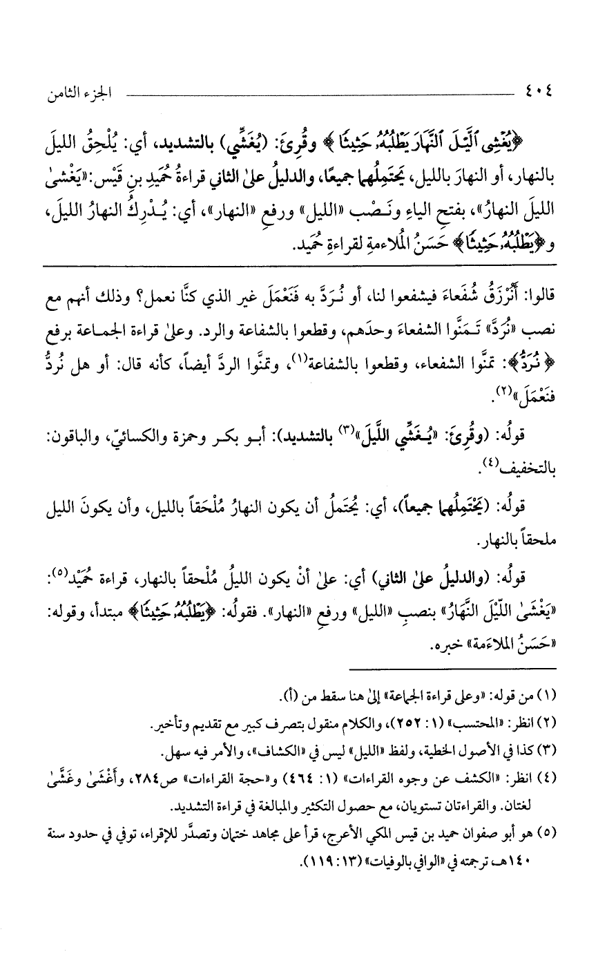 (يُغْشِي اللَّيْلَ النَّهارَ يَطْلُبُهُ حَثِيثاً) وقرئ: (يغشي) بالتشديد، أي: يلحق الليل النهار، أو النهار بالليل يحتملهما جميعاً. والدليل على الثاني قراءة حميد بن قيس: "يغشى الليل النهار"، بفتح الياء ونصب "الليل" ورفع "النهار"، أي: يدرك النهار الليل و (يطلبه حثيثاً) حسن الملاءمة لقراءة حميد.