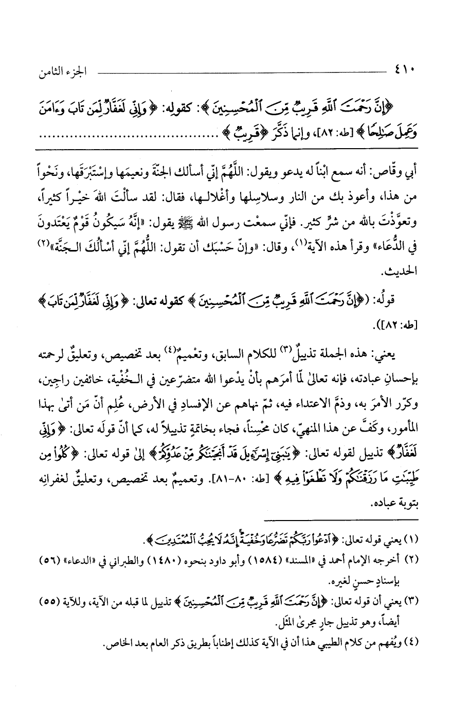 أبي وقاص: أنه سمع ابنًا له يدعو ويقول: اللهم إني أسألك الجنة ونعيمها وإستبرقها، ونحواً من هذا، وأعوذ بك من النار وسلاسلها وأغلالها، فقال: لقد سألت الله خيراً كثيراً، وتعوذت بالله من شر كثير. فإني سمعت رسول الله صلي الله عليه وسلم يقول: "إنه سيكون قوم يعتدون في الدعاء" وقرأ هذه الآية، وقال: "وإن حسبك أن تقول: اللهم إني أسألك الجنة" الحديث.
