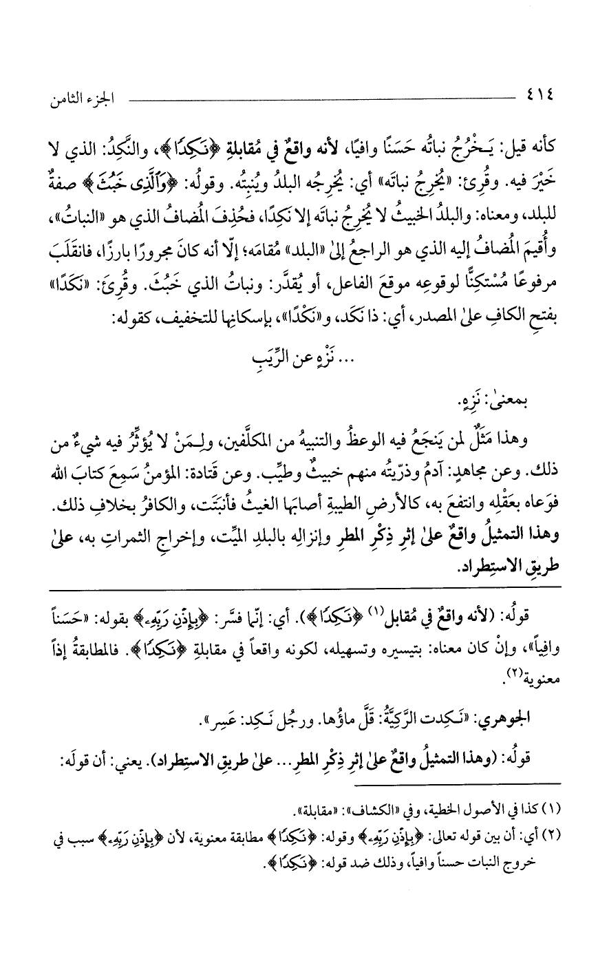 قوله: (لأنه واقع في مقابل (نكداً). أي: إنما فسر: (بإذن ربه) بقوله: "حسناً وافياً"، وإن كان معناه: بتيسيره وتسهيله، لكونه واقعاً في مقابلة (نكداً). فالمطابقة إذاً معنوية.