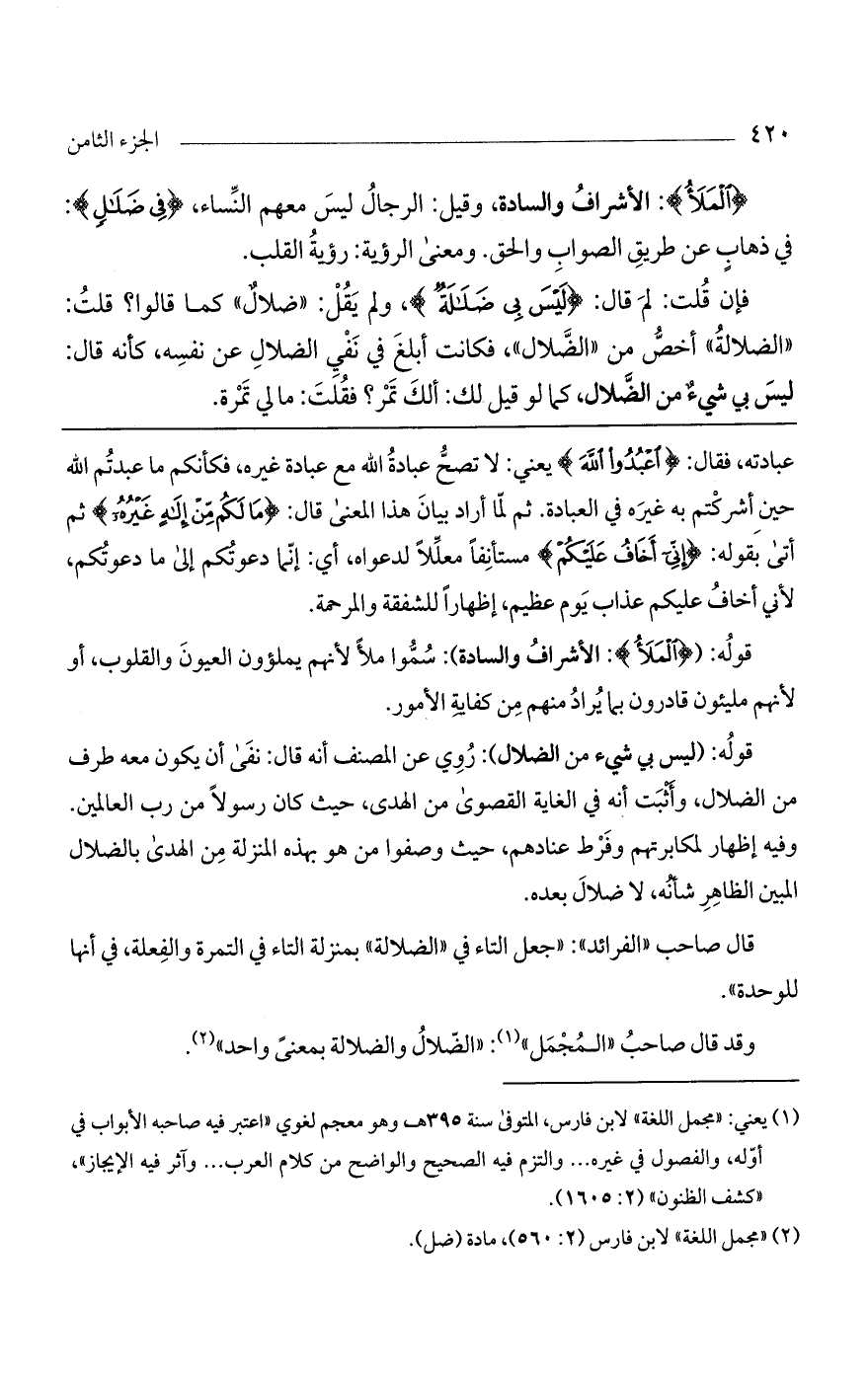 (الْمَلَأُ): الأشراف والسادة، وقيل: الرجال ليس معهم النساء، (فِي ضَلالٍ): في ذهابٍ عن طريق الصواب والحق. ومعنى الرؤية: رؤية القلب.