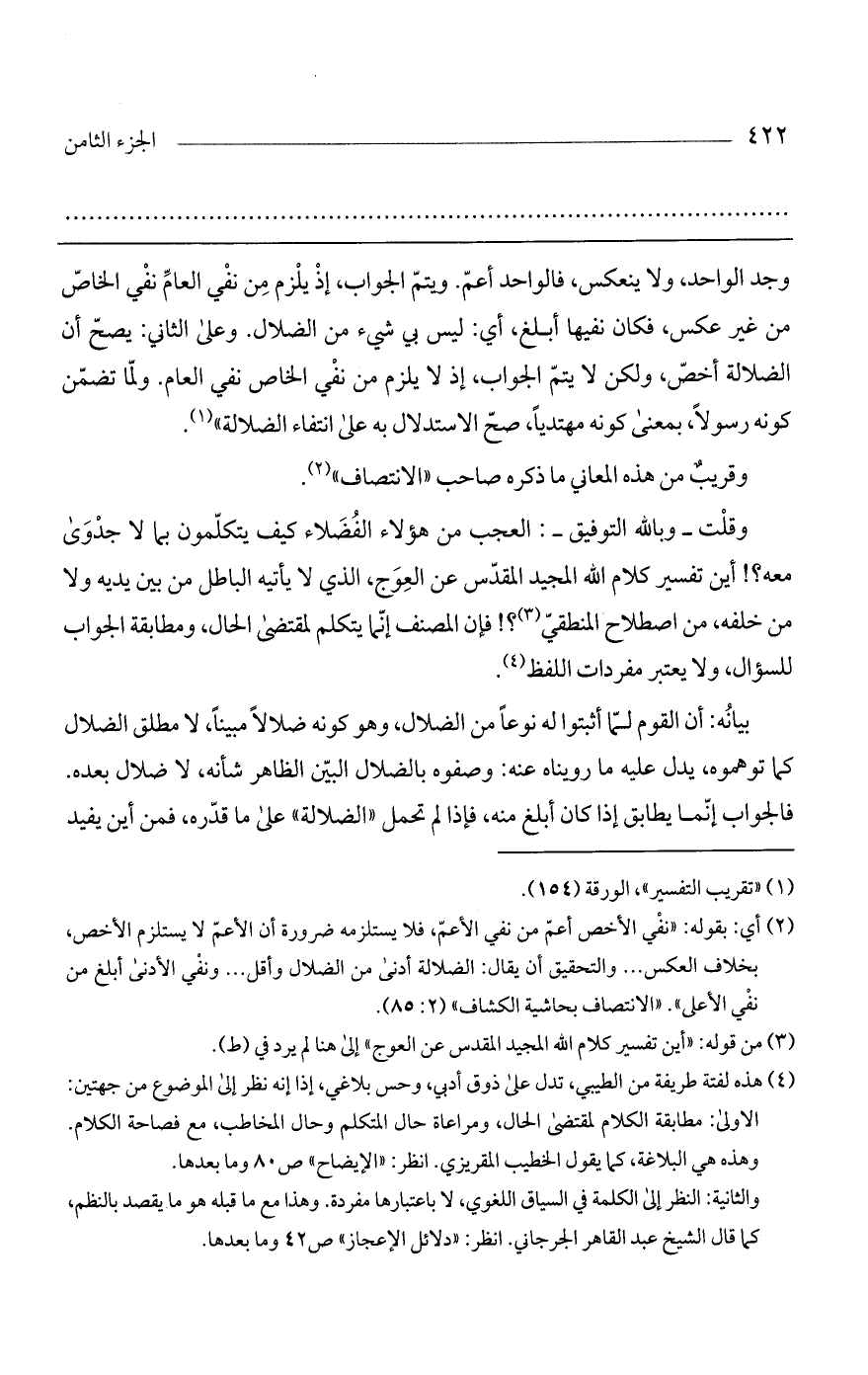 وقلت - وبالله التوفيق -: العجب من هؤلاء الفضلاء كيف يتكلمون بما لا جدوى معه؟ ! أين تفسير كلام الله المجيد المقدس عن العوج، الذي لا يأتيه الباطل من بين يديه ولا من خلفه، من اصطلاح المنطقي؟ ! فإن المصنف إنما يتكلم لمقتضى الحال، ومطابقة الجواب للسؤال، ولا يعتبر مفردات اللفظ.