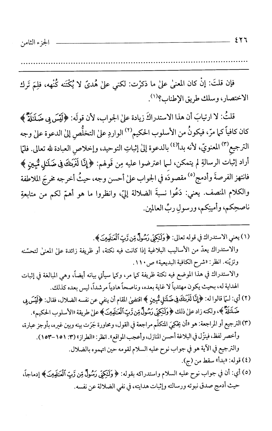 قلت: لا ارتياب أن هذا الاستدراك زيادة على الجواب، لأن قوله: (ليس بي ضلالة) كان كافياً كما مر، فيكون من الأسلوب الحكيم الوارد على التخلص إلى الدعوة على وجه الترجيع المعنوي، لأنه بدأ بالدعوة إلى إثبات التوحيد، وإخلاص العبادة لله تعالى. فلما أراد إثبات الرسالة لم يتمكن، لما اعترضوا عليه من قولهم: (إنَّا لَنَرَاكَ فِي ضَلالٍ مِبينٍ) فانتهز الفرصة وأدمج مقصوده في الجواب على أحسن وجه، حيث أخرجه مخرج الملاطفة والكلام المنصف. يعني: دعوا نسبة الضلالة إلى، وانظروا ما هو أهم لكم من متابعة ناصحكم، وأمينكم، ورسول رب العالمين.