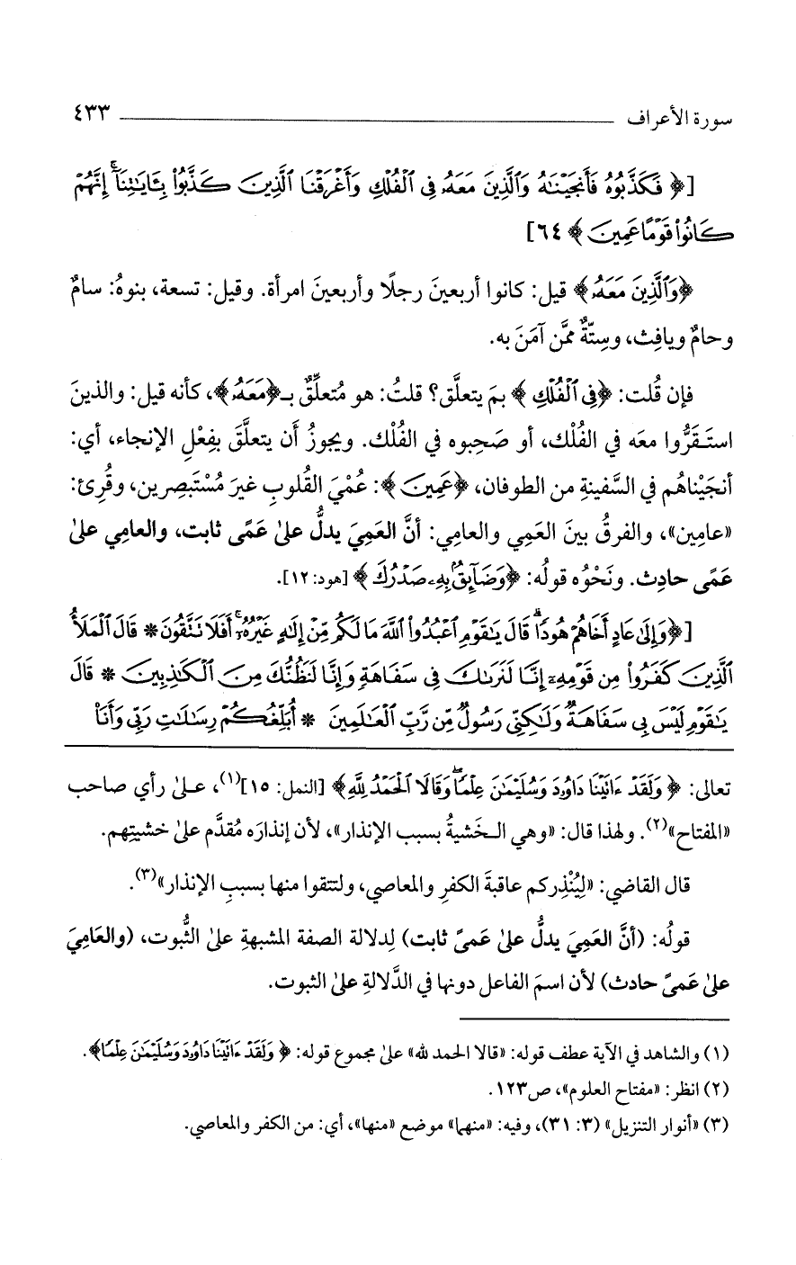 تعالى: (ولَقَدْ آتَيْنَا دَاوُدَ وسُلَيْمَانَ عِلْمًا وقَالا الحَمْدُ لِلَّهِ) [النمل: 15]، على رأي صاحب "المفتاح". ولهذا قال: "وهي الخشية بسبب الإنذار"، لأن إنذاره مقدم على خشيتهم.
