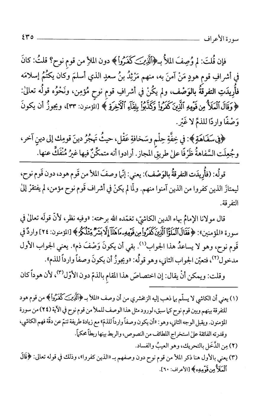 قال مولانا الإمام بهاء الدين الكاشي، تغمده الله برحمته: "وفيه نظر، لأن قوله تعالى في سورة "المؤمنين": (فَقَالَ المَلأُ الَّذِينَ كَفَرُوا مِن قَوْمِهِ مَا هَذَا إلاَّ بَشَرٌ مِّثْلُكُمْ) [المؤمنون: 24] وارد في قوم نوح، وهو لا يساعد هذا الجواب. بقي أن يكون وصف ذم". يعني الجواب الأول مدخول، فتعين الجواب الثاني، وهو قوله: "ويجوز أن يكون وصفاً وارداً للذم".