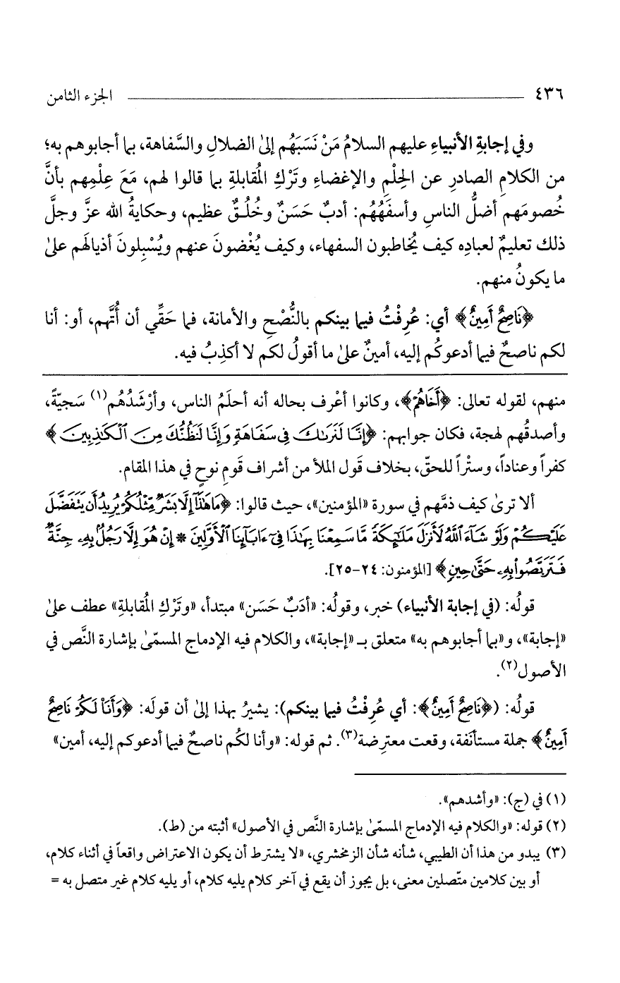 وفي إجابة الأنبياء عليهم السلام من نسبهم إلى الضلال والسفاهة، بما أجابوهم به، من الكلام الصادر عن الحلم والإغضاء وترك المقابلة، بما قالوا لهم مع علمهم بأنّ خصومهم أضلّ الناس وأسفههم: أدبٌ حسنٌ وخلقٌ عظيم، وحكاية الله عزّ وجلّ ذلك تعليم لعباده كيف يخاطبون السفهاء وكيف يغضون عنهم ويسبلون أذيالهم على ما يكون منهم.