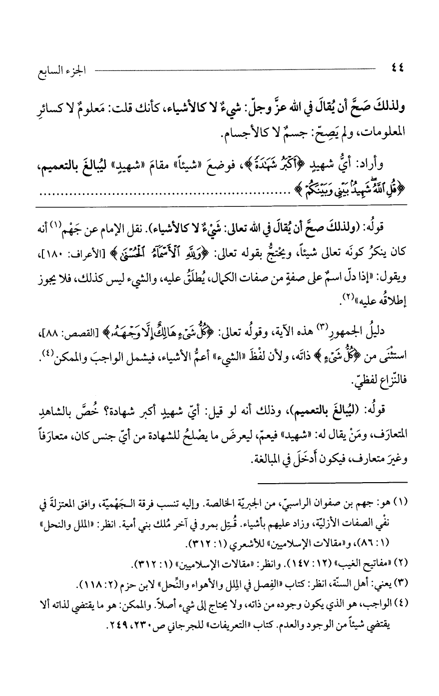 قوله: (ولذلك صح أن يقال في الله تعالى: شيء لا كالأشياء). نقل الإمام عن جهم أنه كان ينكر كونه تعالى شيئًا، ويحتج بقوله تعالى: {ولِلَّهِ الأَسْمَاءُ الحُسْنَى {[الأعراف: 180]، ويقول: "إذا دل اسم على صفةٍ من صفات الكمال، يطلق عليه، والشيء ليس كذلك، فلا يجوز إطلاقه عليه".