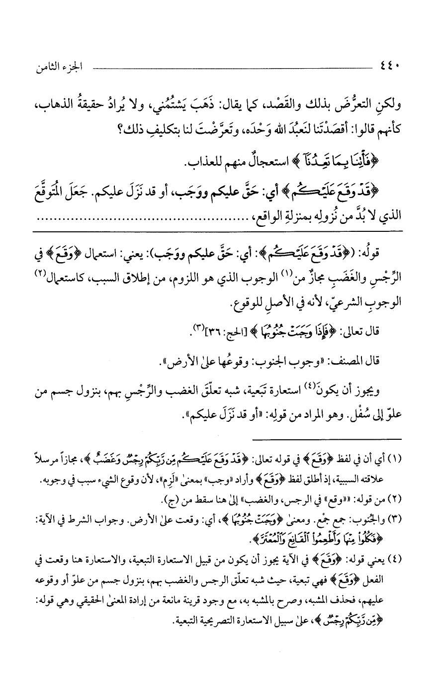 قوله: ((قد وقع عليكم): أي: حق عليكم ووجب): يعني: استعمال (وقع) في الرجس والغضب مجاز من الوجوب الذي هو اللزوم، من إطلاق السبب، كاستعمال الوجوب الشرعي، لأنه في الأصل للوقوع.