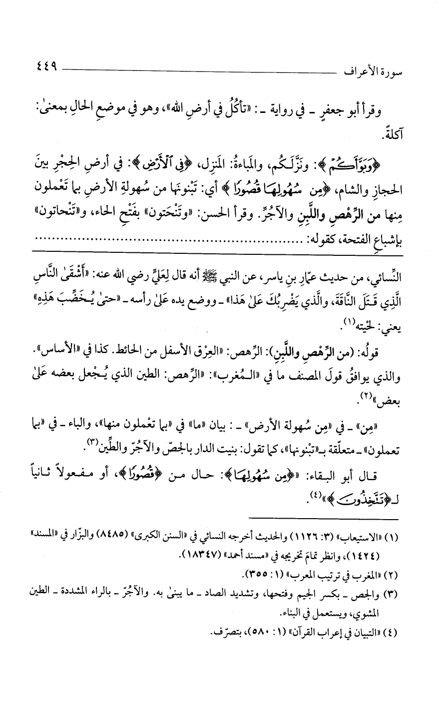 (وَبَوَّأَكُمْ): ونزلكم، والمباءة: المنزل (فِي الْأَرْضِ): في أرض الحِجرِ بين الحجاز والشام، (مِنْ سُهُولِها قُصُوراً) أي: تبنونها من سهولة الأرض بما تعملون منها من الرهص واللبن والآجر. وقرأ الحسن: "وتنحتون" بفتح الحاء، و"تنحاتون" بإشباع الفتحة، كقوله: