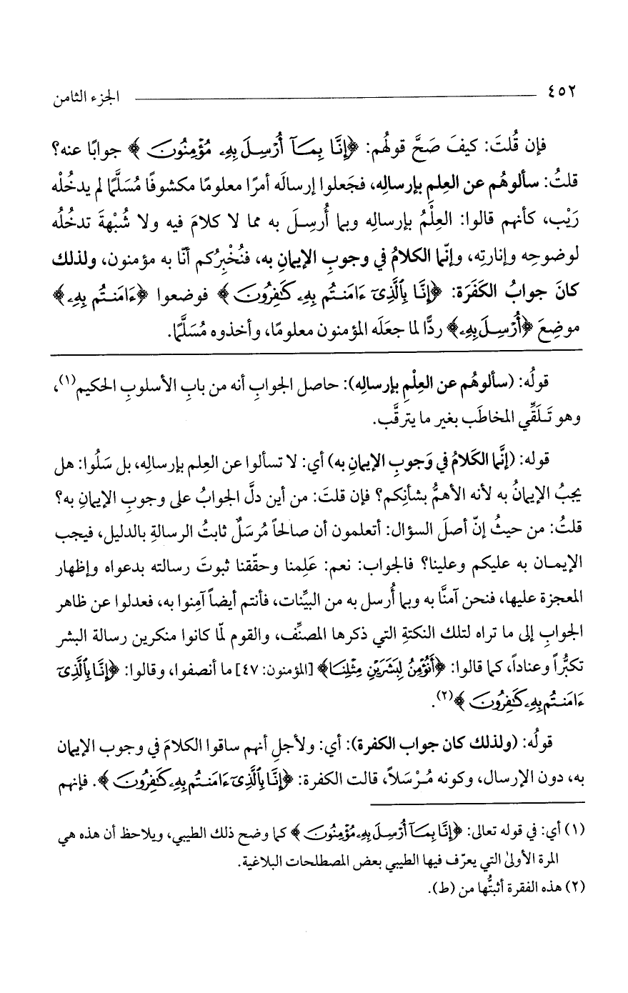 قوله: (ولذلك كان جواب الكفرة): أي: ولأجل أنهم ساقوا الكلام في وجوب الإيمان به، دون الإرسال، وكونه مرسلاً، قالت الكفرة: (إنَّا بِالَّذِي آمَنتُم بِهِ كَافِرُونَ). فإنهم
