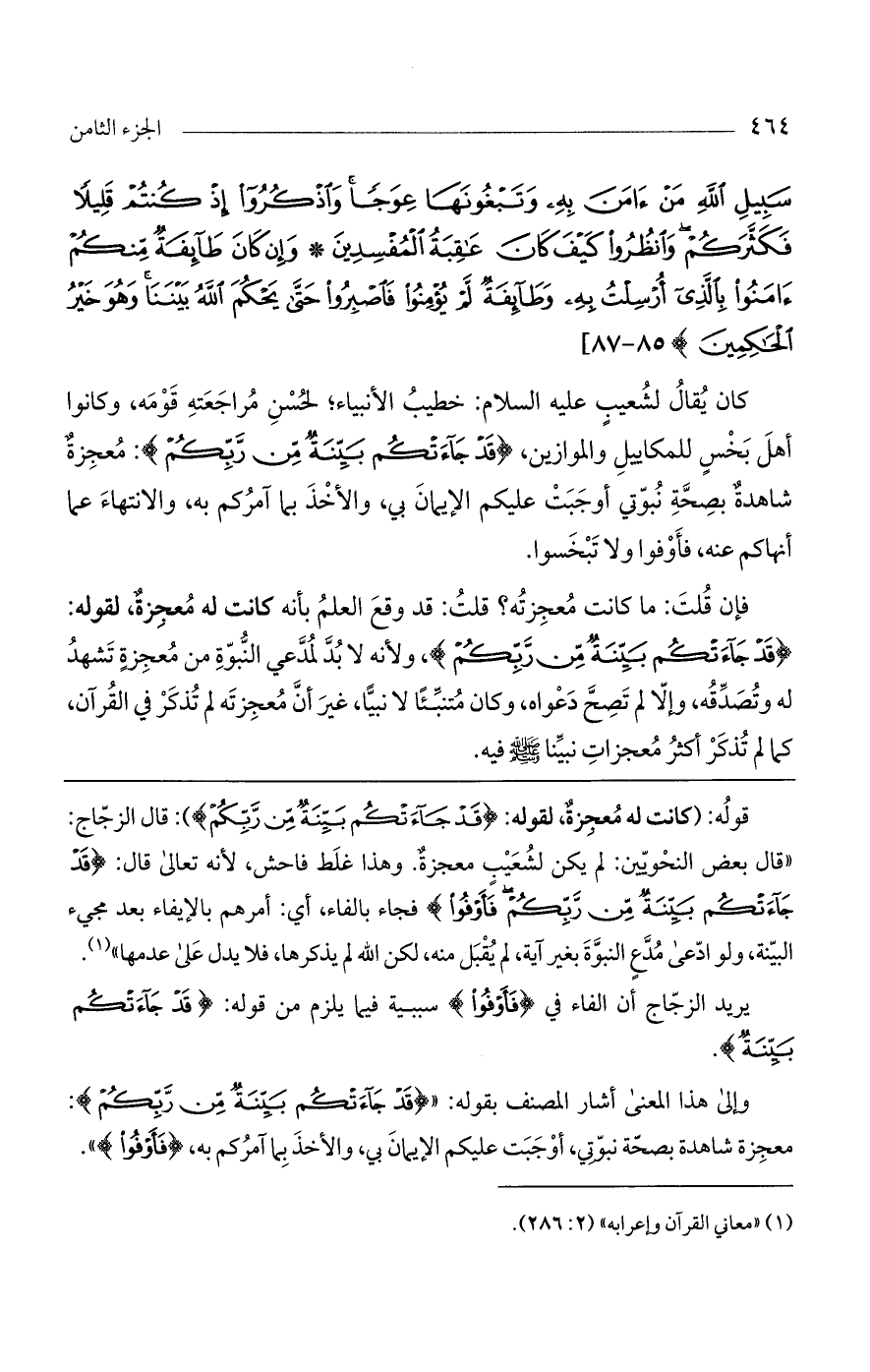 قوله: (كانت له معجزة، لقوله: (قَدْ جَاءَتْكُم بَيِّنَةٌ مِّن رَّبِّكُمْ)): قال الزجاج: "قال بعض النحويين: لم يكن لشعيب معجزة. وهذا غلط فاحش، لأنه تعالى قال: (قَدْ جَاءَتْكُم بَيِّنَةٌ مِّن رَّبِّكُمْ فَأَوْفُوا) فجاء بالفاء، أي: أمرهم بالإيفاء بعد مجيء البينة، ولو ادعى مدعٍ النبوة بغير آية، لم يقبل منه، لكن الله لم يذكرها، فلا يدل على عدمها".